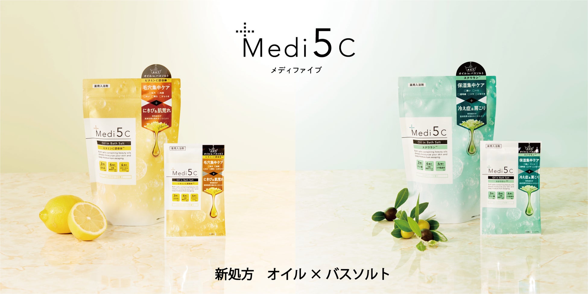 忙しい毎日のなかで、私たちが抱える悩みは複合的。だからMedi5C(メディファイブ)は、「オイル×バスソルト」の新処方の入浴剤を開発しました。オイルによる全身のスキンケアと、疲労回復や肩こり*³などのボディメンテナンスの両方を、一度に。明日を充実させるバスタイムへ導きます。
