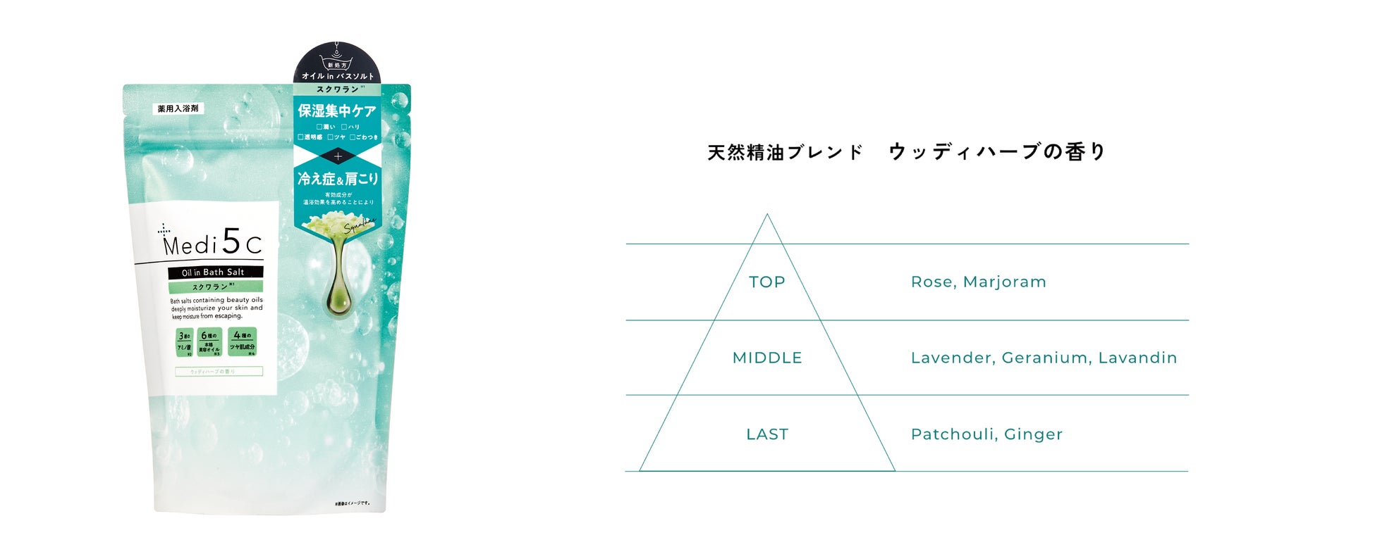 そこでMedi5C(メディファイブ)は、肩こりや冷え症、疲労回復*³などに効果のある薬用バスソルトをベースに、オイル美容液をブレンドし美肌効果を強化したハイブリッドな入浴剤を開発。一度の入浴で多様かつ具体的なお悩みに向き合うことを可能にしました。