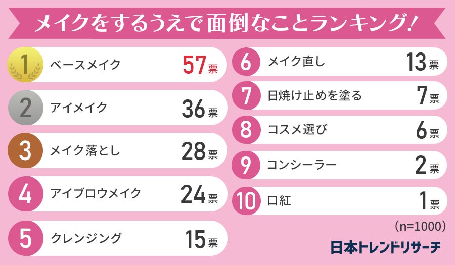 メイクをするうえで面倒なことランキング、第1位は「ベースメイク」でした。