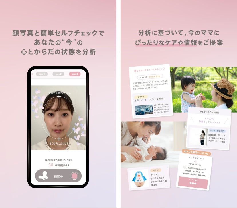 産後特有の悩みを解決するケア方法や、乳幼児ファミリーを手助けするサービス、赤ちゃんとの生活がもっと楽しくなる情報、月齢に合わせた育児情報などが提案されます。