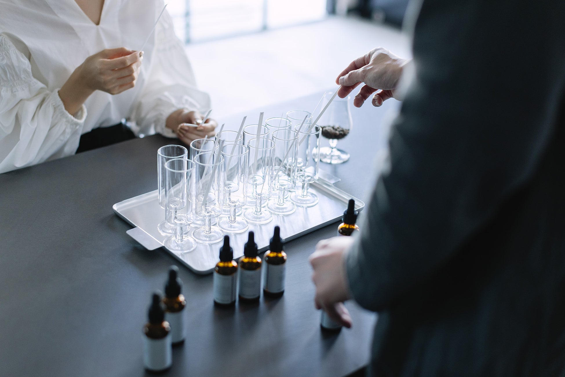 香料の組み合わせ次第で無限に新しい香りとの出会いを体験できるフレグランスの調香は、カクテルのブレンドにも似ています。