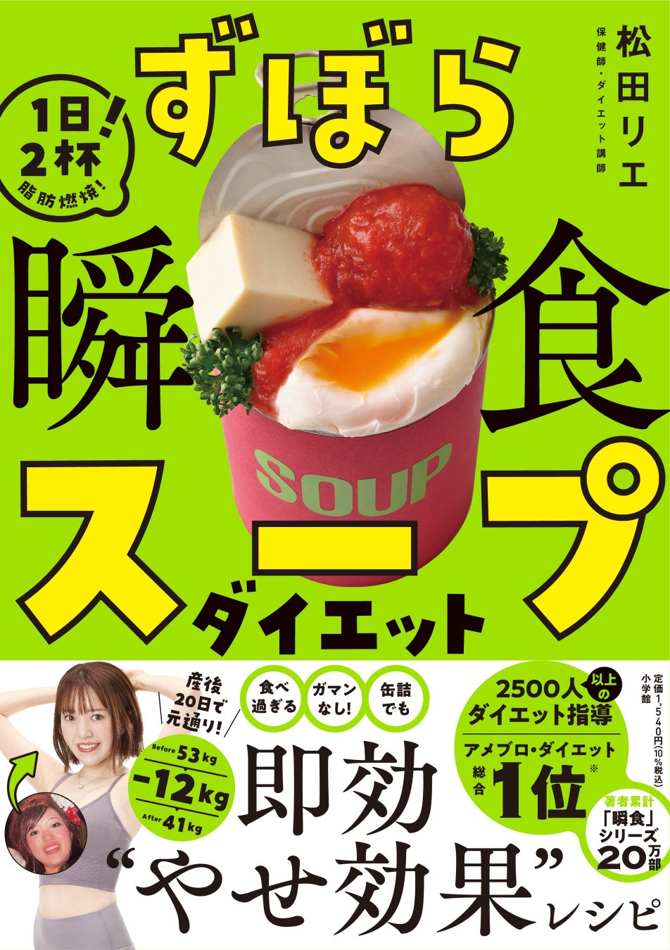 元看護師・保健師、現在ダイエット講師として大活躍する松田リエ氏。「やせたいなら食べなさい」をモットーに、数々の書籍を執筆しています。『ずぼら瞬食ダイエット』(小学館)は発行部数67,000部を突破、ベストセラーとなりました。そして今回、続編である『ずぼら瞬食スープダイエット』が10月25日(水)に小学館より発売することが決定、本日予約を開始しました。簡単に作れて、「即効やせ」がかなうダイエット料理本です。