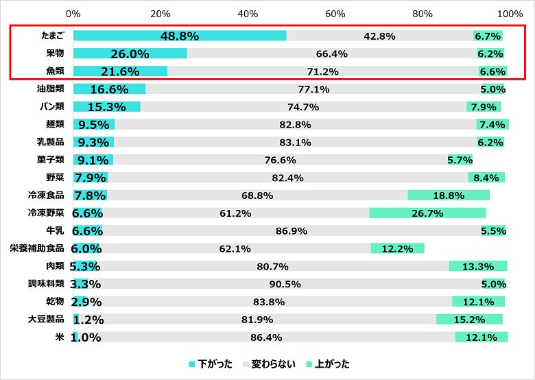 油脂類、乳製品、調味料類、牛乳、パン類、肉類、冷凍食品、野菜、果物、麺類は8割以上が「値上がりした」と回答。そのほか、冷凍野菜、菓子類など米以外の食材についても半数以上が値上がりを感じている。