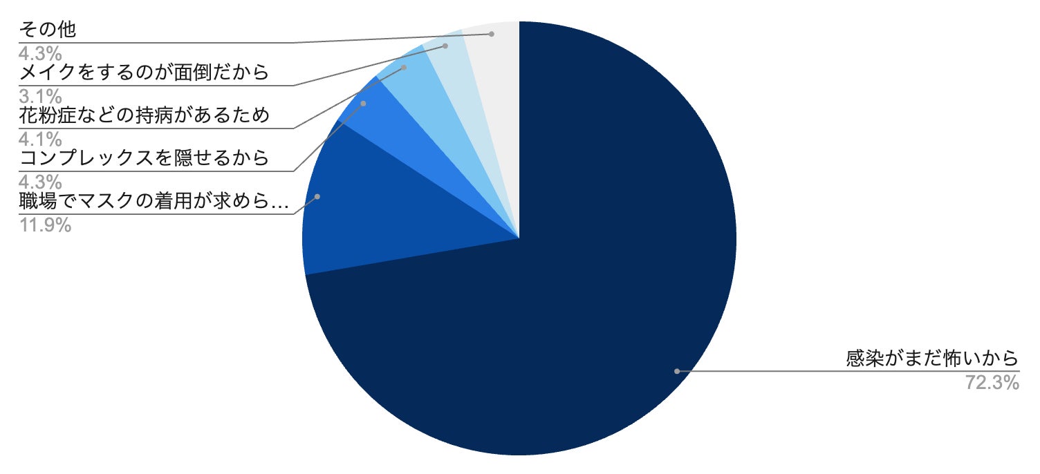 72.3%が「感染がまだ怖いから」と回答。しかしそれ以外の理由として「職場で着用を求められる(11.9%)」「コンプレックスを隠せる(4.3%)」「花粉症などの持病があるため(4.1%)」「メイクをするのが面倒だから(3.1%)」などが挙がり、その合計は27.7%となり、感染を避けるための自主的なマスク着用以外の理由でマスクをする人が、全体の1/4以上いることがわかりました。