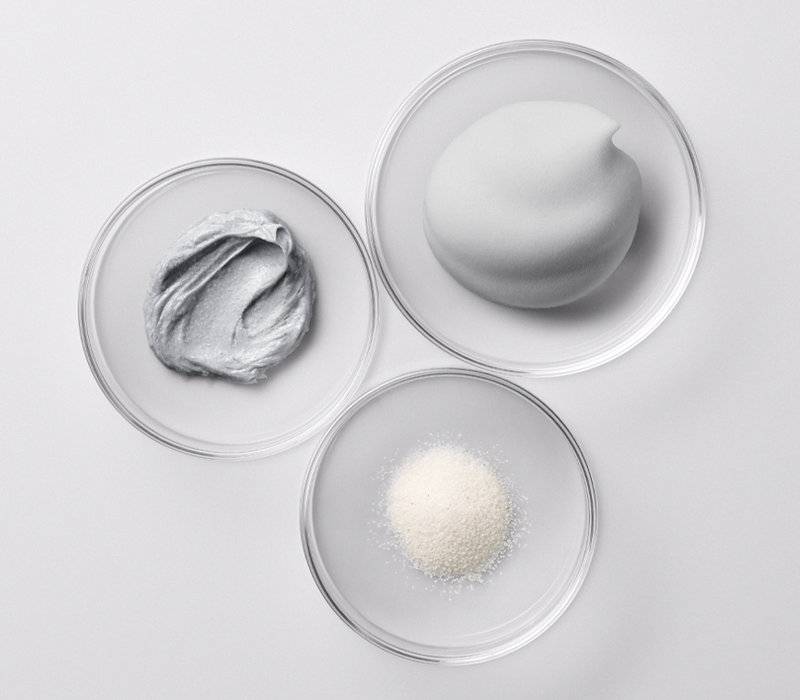肌あたりのやさしいマンナンスクラブ*⁷が汚れを絡め取り、古い角質によってゴワついた肌やザラつき*⁹もケアします。さらに、重曹*⁶・酵素*²が毛穴*⁴の黒ずみ*⁹・角栓を分解*¹してスッキリ落とし、つるんとした美肌へと導きます。