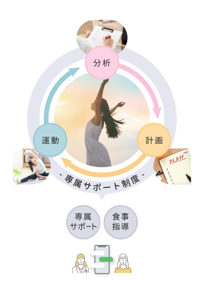SOCOでは「分析」「計画」「運動」のサイクルを回すと共に、ユーザーに「専属サポーター」がついて身体トラブルと体型の改善の達成を後押しします。
