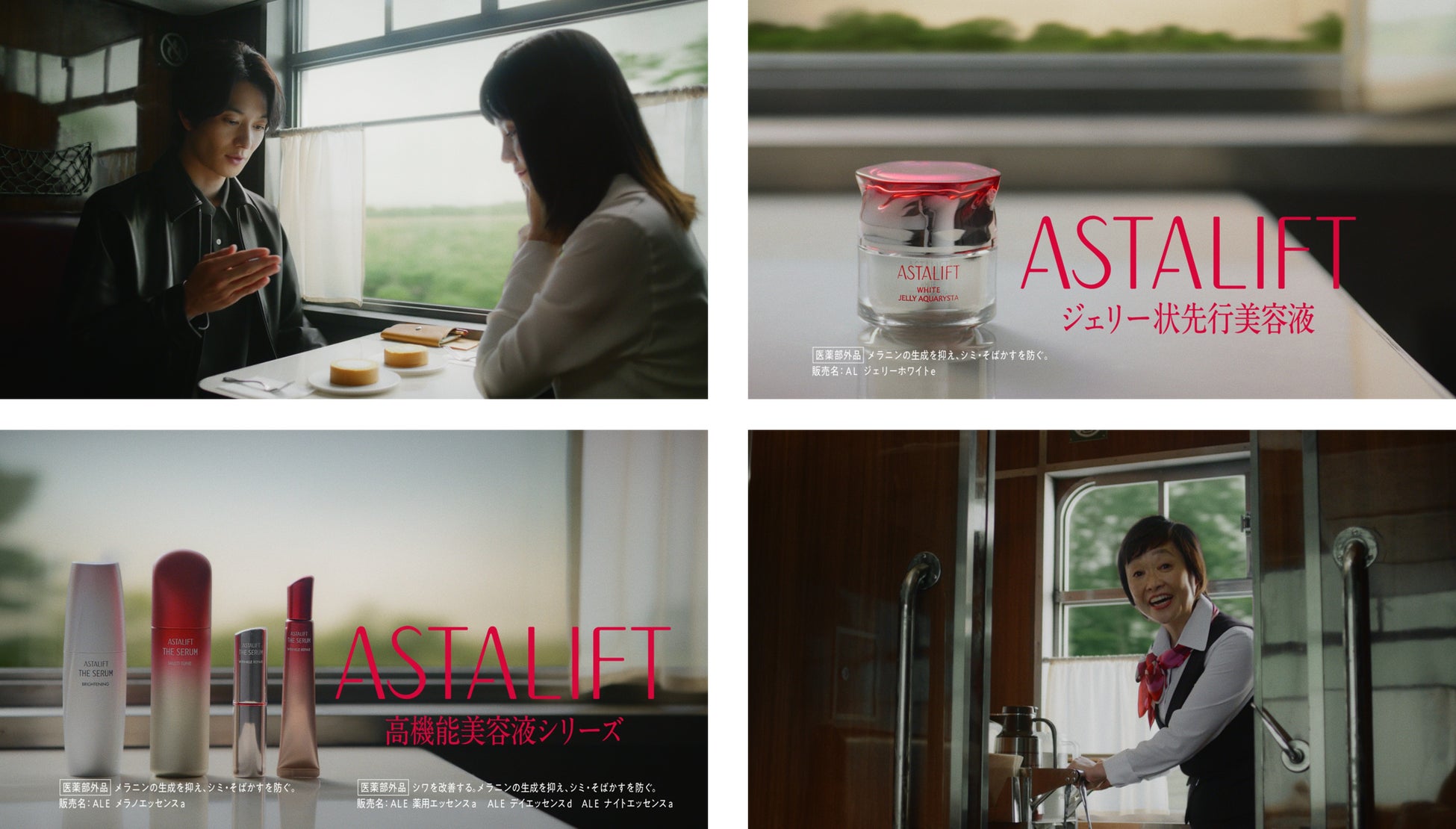 新TVCM「列車のふたり 赤の力」篇と「列車のふたり リポソーム」篇には、俳優の宮﨑あおいさんと岡田将生さんが出演。「列車のふたり リポソーム」篇には、ふたりに加え、新たに客室乗務員役として、増田明美さんが登場します。列車で偶然出会った宮﨑さんと岡田さんの会話を通じて、土台ケア(※2)から、エイジングケア(※1)まで叶えるジェリー状先行美容液「アスタリフト ホワイト ジェリー アクアリスタ」や、大人の深い肌悩みにフォーカスし、その一つひとつに対し最適なケアを極めた(※3)高機能美容液シリーズ「アスタリフト ザ セラム」の特長を伝えます。「アスタリフト」の特徴成分であり独自のナノ分散技術で微細化した「ナノアスタキサンチン(※4)」と、化粧品以外のヘルスケア分野で培ったリポソーム技術を化粧品向けに応用して開発した当社独自の浸透型リポソーム(※5)を、赤いスポンジボールやロールケーキを使って説明するシーンにご注目ください。