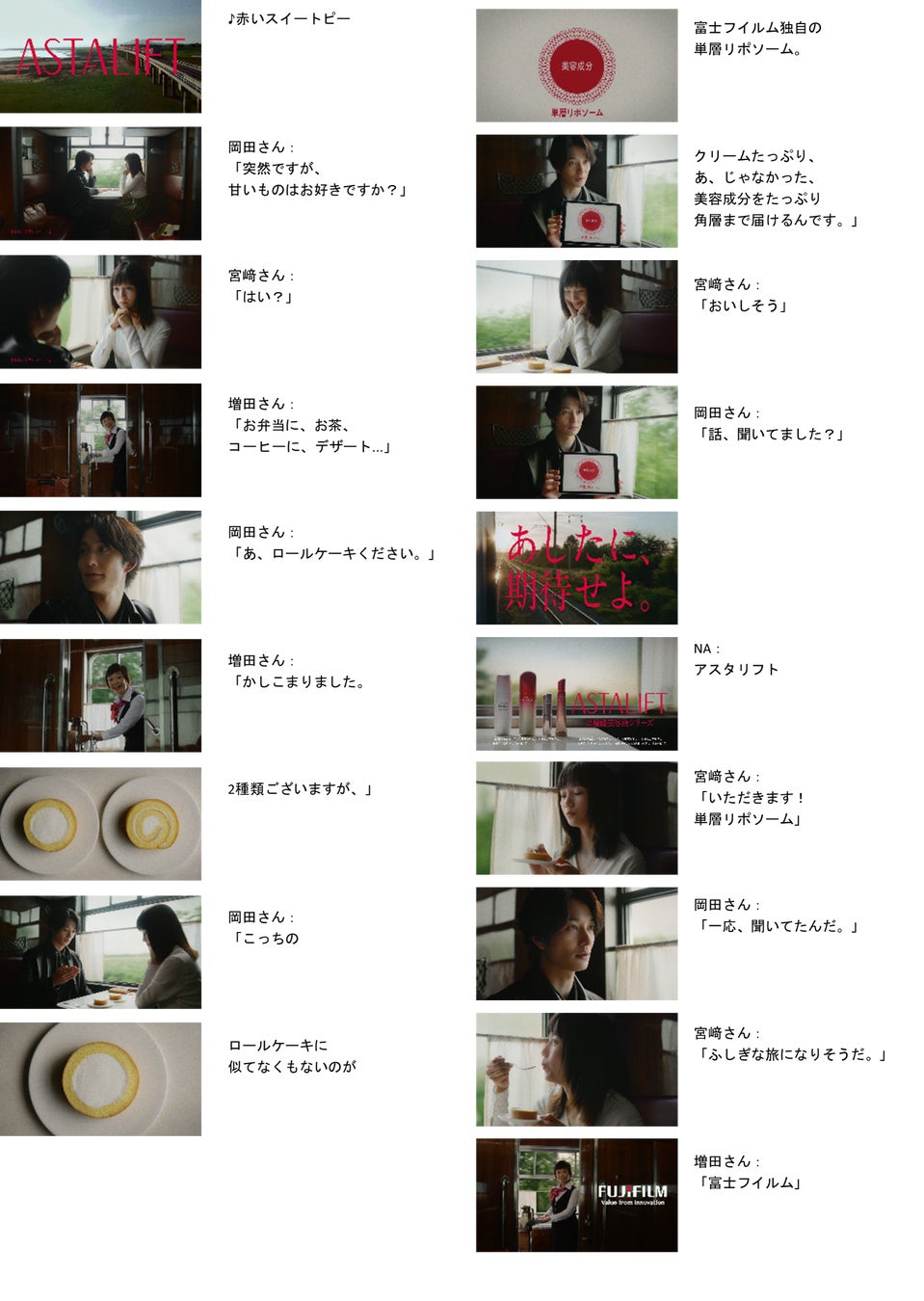 列車の客室で向かい合う男女。男が車内販売で「ロールケーキ」を注文する。続けて男は説明する。「クリームたっぷりのロールケーキ」に似ているというのが、富士フイルム独自の浸透型リポソーム(※5)。一層の膜で形成する「単層」構造で内部に多くの美容成分を含有する機能をもち、必要な成分を肌に届ける(※6)。「ロールケーキ」が気になる女。コンパートメントの入り口には、何故かまだ居る客室乗務員。期待に満ちたあしたに向かって、ふしぎな列車の旅は、まだ、続く・・・。