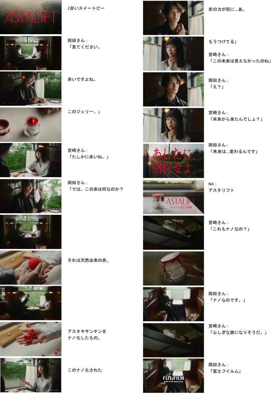 今回放映を開始する2篇のTVCMは、宮﨑あおいさん演じる“何かから逃れるように列車に乗り込む女性”と、岡田将生さん演じる“未来から来た男性”の、ふしぎな列車の旅の様子を描く「あしたに、期待せよ。」シリーズの続篇です。写真フィルムの開発で培った技術を活用し“実感できる”スキンケアを目指す「アスタリフト」の魅力を、宮﨑さんと岡田さんのふたりの会話と「あしたに、期待せよ。」というキャッチコピーでお伝えします。楽曲には、前篇に引き続き松田聖子さんの名曲「赤いスイートピー」を使用しています。「列車のふたり リポソーム」篇には、ふたりが乗車する列車の客室乗務員役として増田明美さんが新たに登場します。