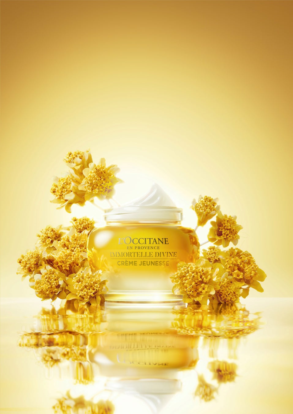摘んだ後も黄色の鮮やかな色を保つことから永久花と呼ばれるほど生命力の高い花 “イモーテル”。ロクシタンは20年以上の研究を重ね様々な美肌効果を見出してきました。その一つが、このイモーテルの花の恵みを余すことなく使いたいというサステナビリティの思いから発見した「イモーテルコアエキス」。エッセンシャルオイル抽出後のイモーテルの花を再利用しさらに抽出したこのエキスは、ロクシタンの以前の研究で、レチノールのような美肌効果を持つことを発見していました。さらに研究を深め、この度新たに「イモーテルコアエキス」の効果としてメラニン抑制効果も新発見しました。
