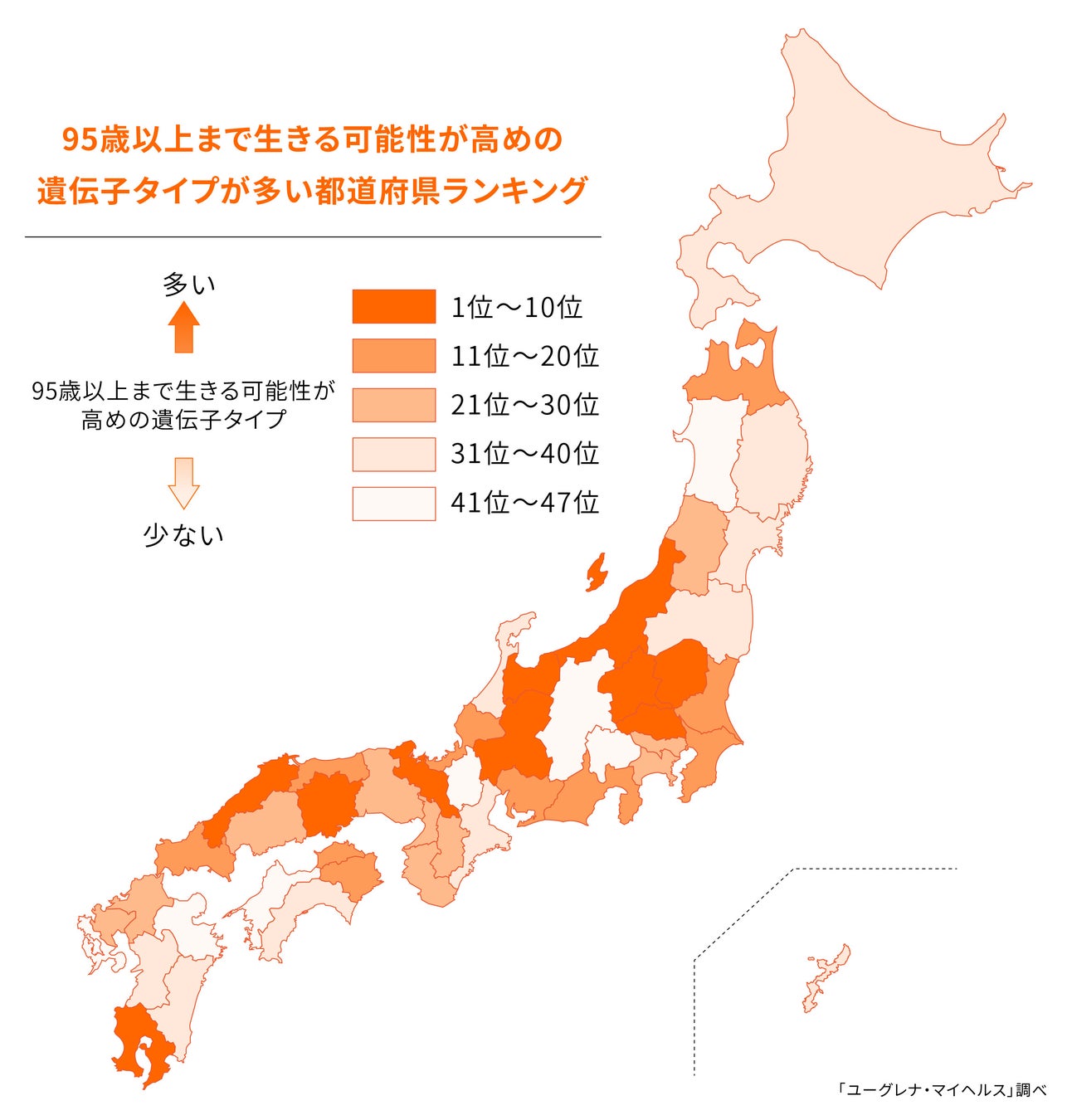 ユーグレナ・マイヘルスとジーンクエストの遺伝子解析サービスの利用者の中から20,000人以上のゲノムデータを用いて、これまで、さまざまな遺伝子タイプに関する都道府県ランキングを発表しています。今回は、ヒトの寿命に深く関与する遺伝子型についての項目「95歳以上まで生きる可能性(SNP:rs2764264)」に注目し、解析しました。