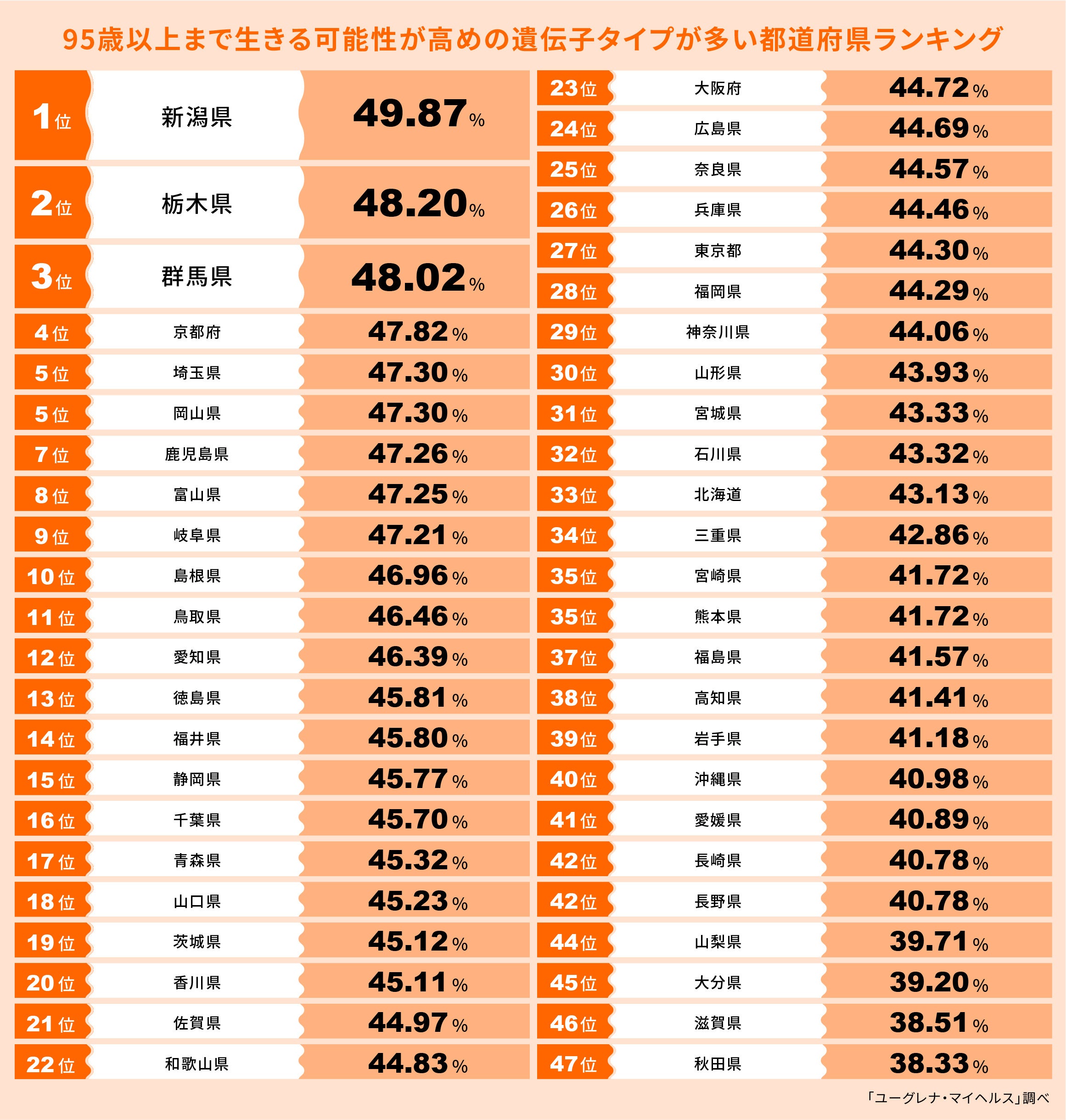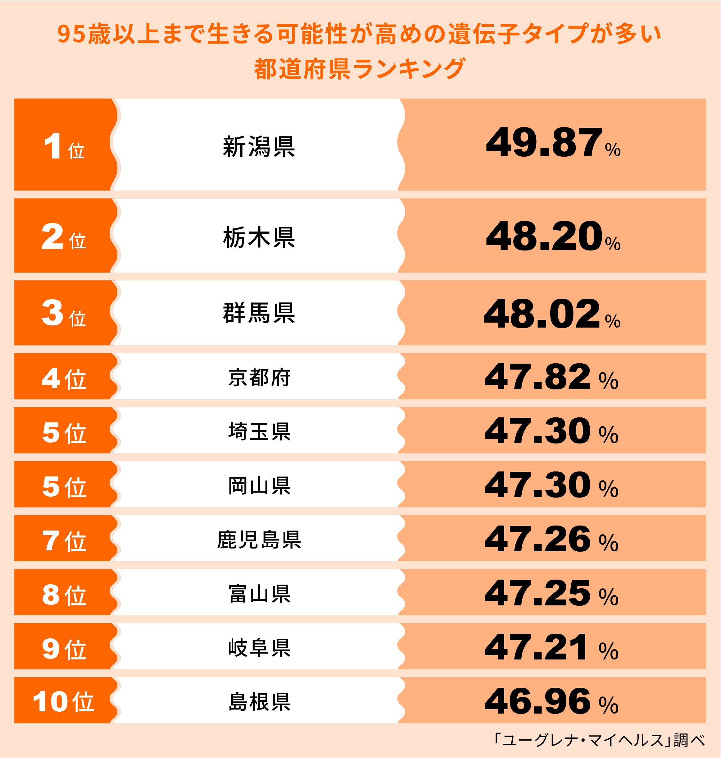 上記の解析結果より、95歳以上まで生きる可能性が高めの遺伝子タイプの人の割合が相対的に高い都道府県は、1位 新潟県、2位 栃木県、3位 群馬県、4位 京都府、5位 埼玉県、岡山県、7位 鹿児島県、8位 富山県、9位 岐阜県、10位 島根県となりました。