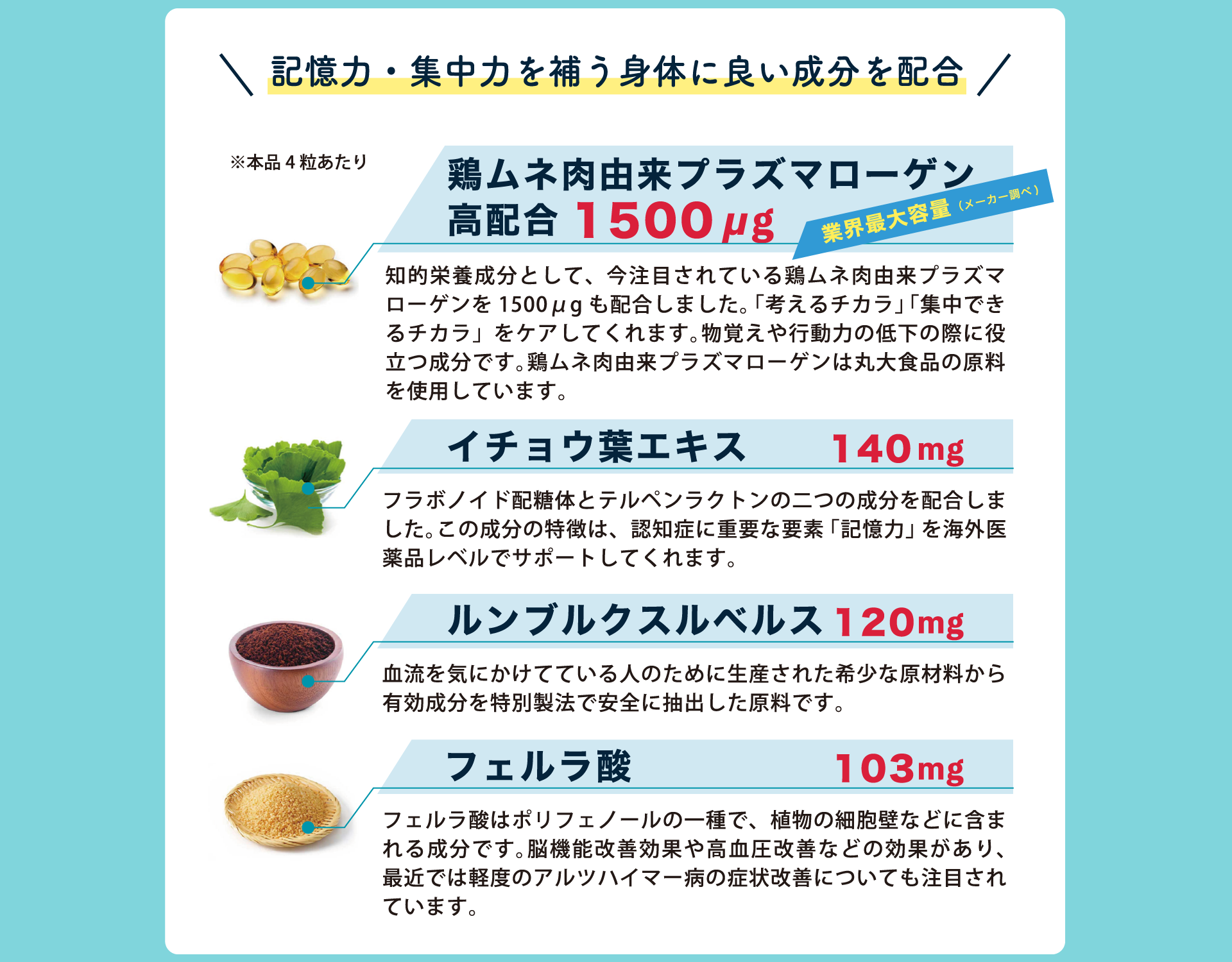 「ルンブルクスルベルス」によって血流を改善し、脳全体に「プラズマローゲン」「イチョウ葉エキス」「フェルラ酸」を届けて脳細胞を健全化させ、そこに「ビタミンB群」が届いて糖を効率よくエネルギーにする。このような効果を期待した組み合わせとなっています。