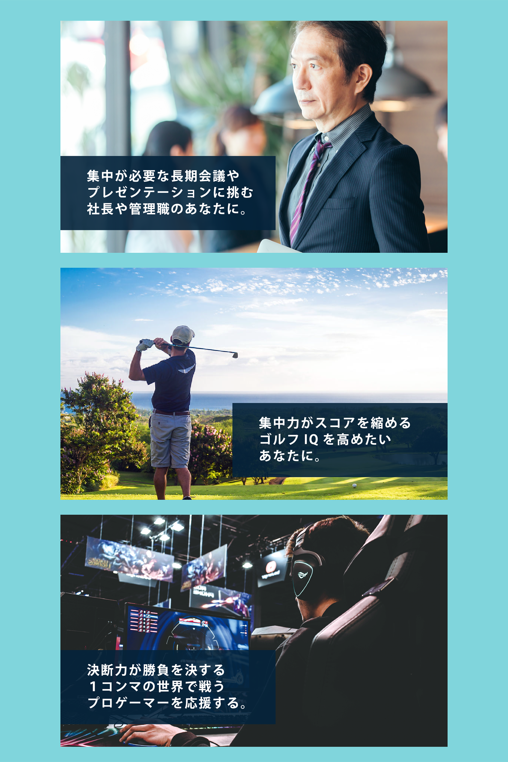 その効能は様々なシーンで発揮し、認知機能や記憶力が気になり始めた方、受験勉強を頑張るお子様から判断力を伴う経営者、集中力が勝負を分かつプロゲーマー、記憶力や認知力がスコアを変えるゴルフプレイヤーにも使っていただけるサプリメントです。