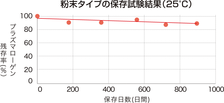有効成分が残存しやすい粉末化プラズマローゲンを1,500マイクログラム配合。消費期限の1.5年後まで1,000マイクログラム以上が残存することが確認されております。