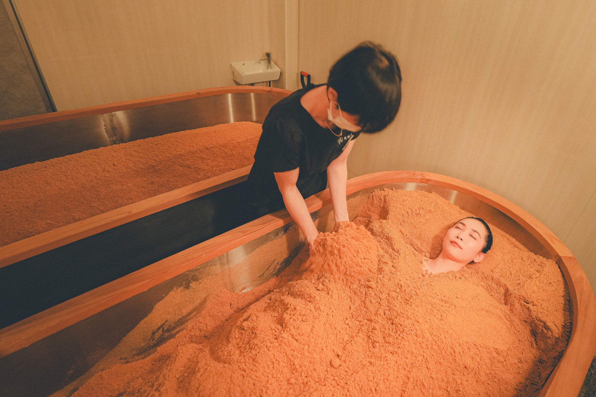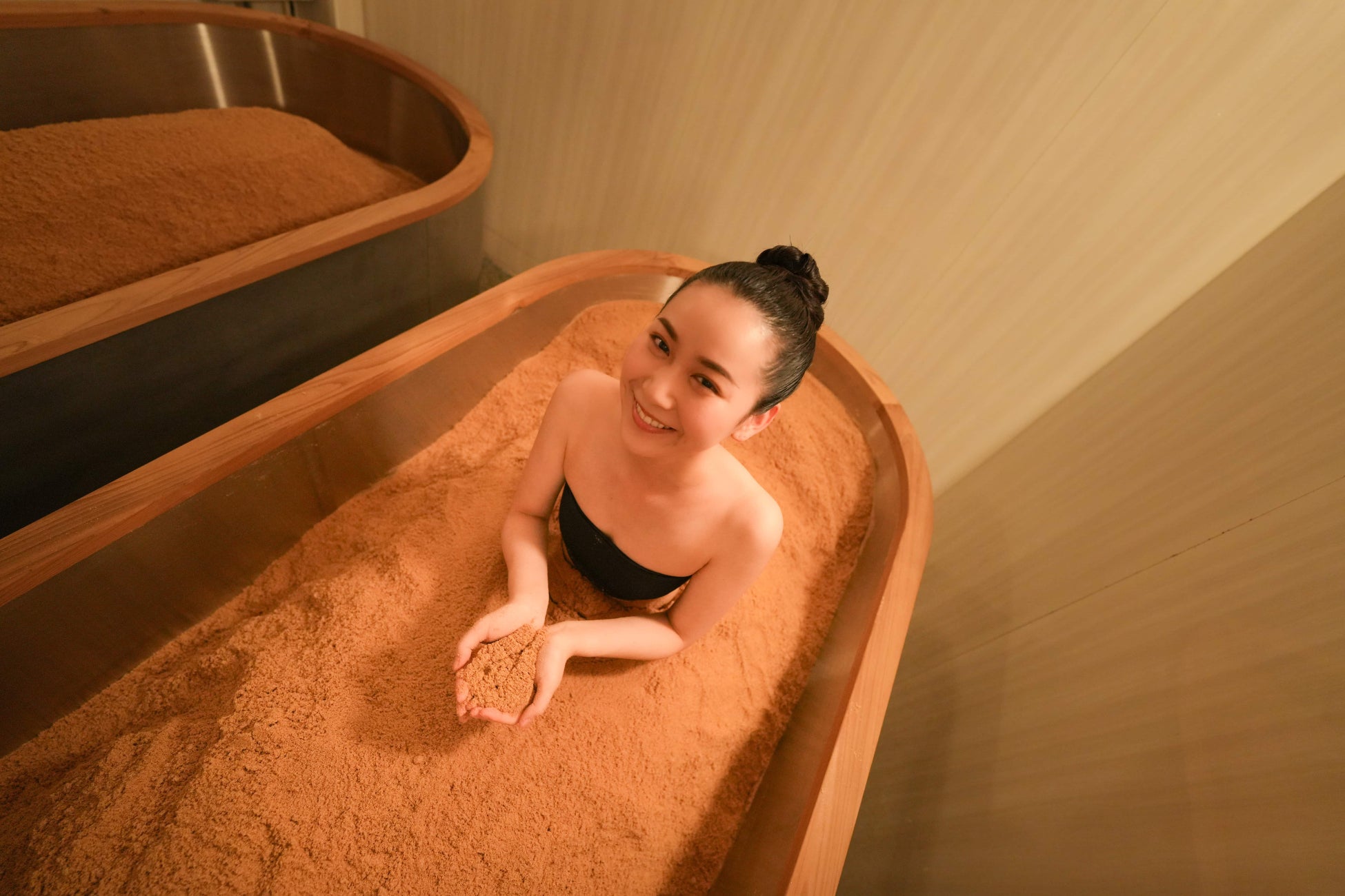 発酵熱は約65~85℃前後、実際の体感温度としては、約40~45℃(15分程の入浴)で、発汗とリフレッシュを堪能いただけます。