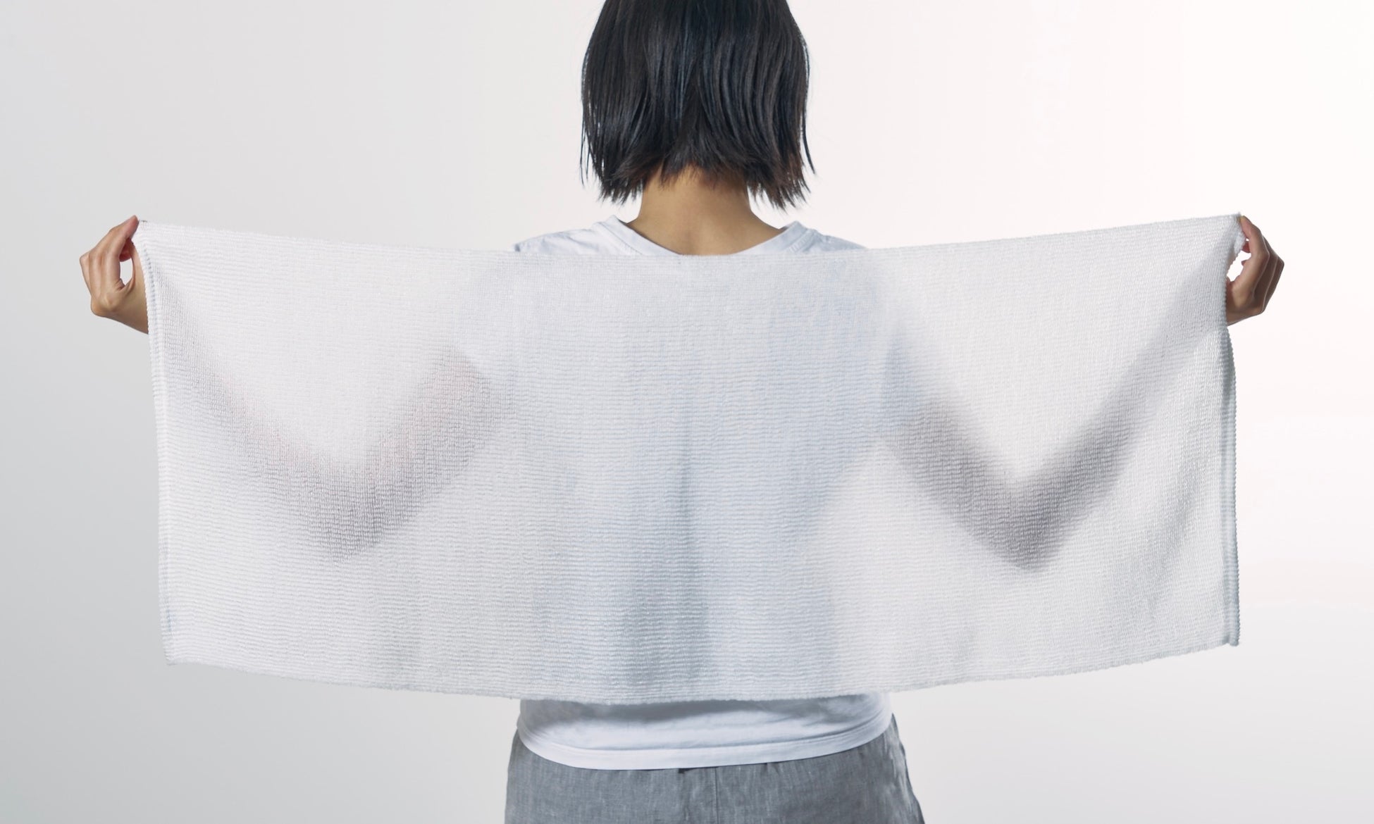 経糸の織り幅を変化させ、緯糸に縮み加工した糸を使用することで、糸が立ち上がる立体的な構造になっています。お湯を含ませると肌あたりが一層ふんわりとして、デコルテなどもやさしく洗え、ナイロンタオルのイメージが変わります。
