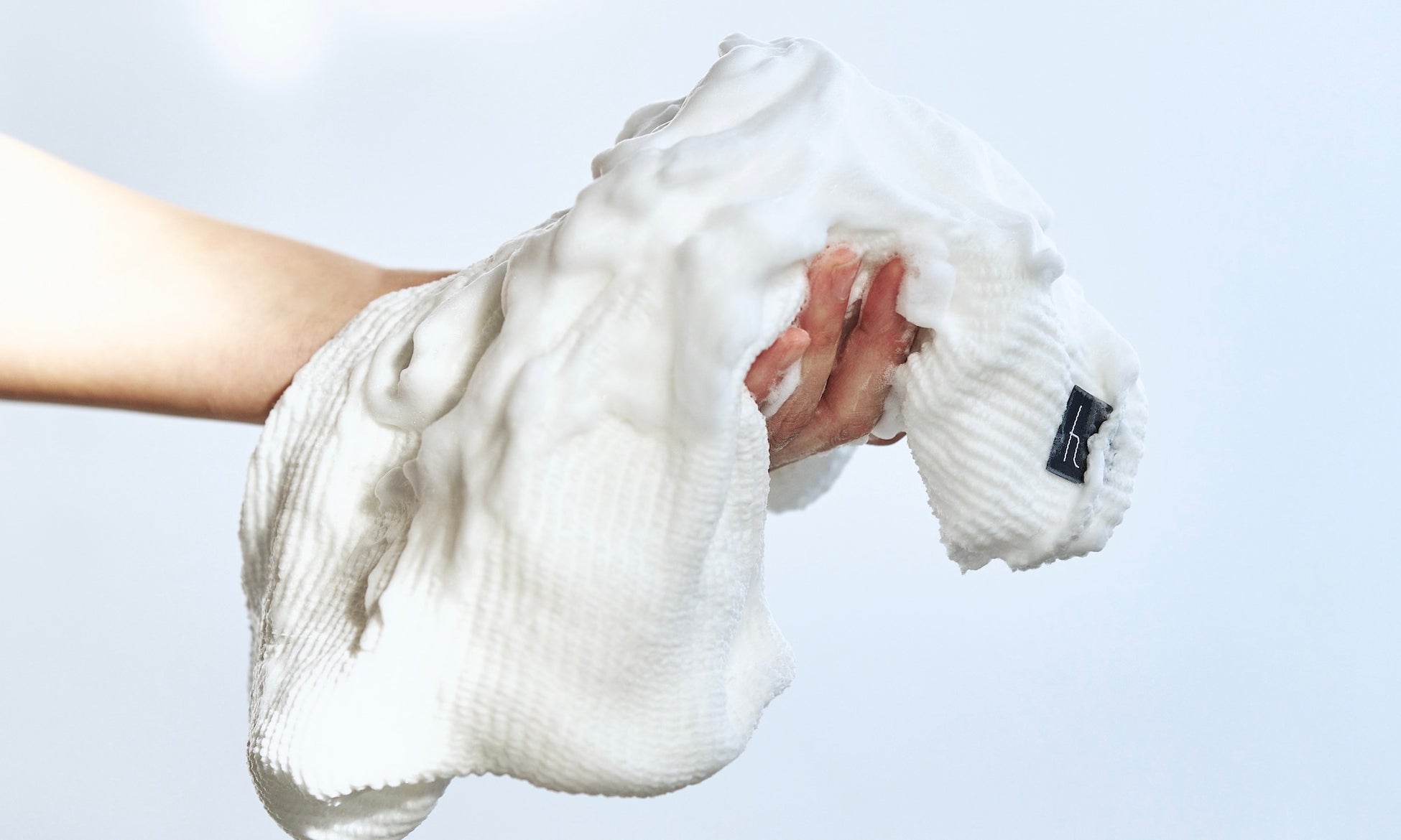 肌の上を一往復するだけで充足感が得られ、こすり過ぎを抑えてなでるように洗えます。水分を含ませると心地よい重みが生まれ、お湯の温かさを感じながら包み込まれるようなやみつきの洗い心地を体験できます。