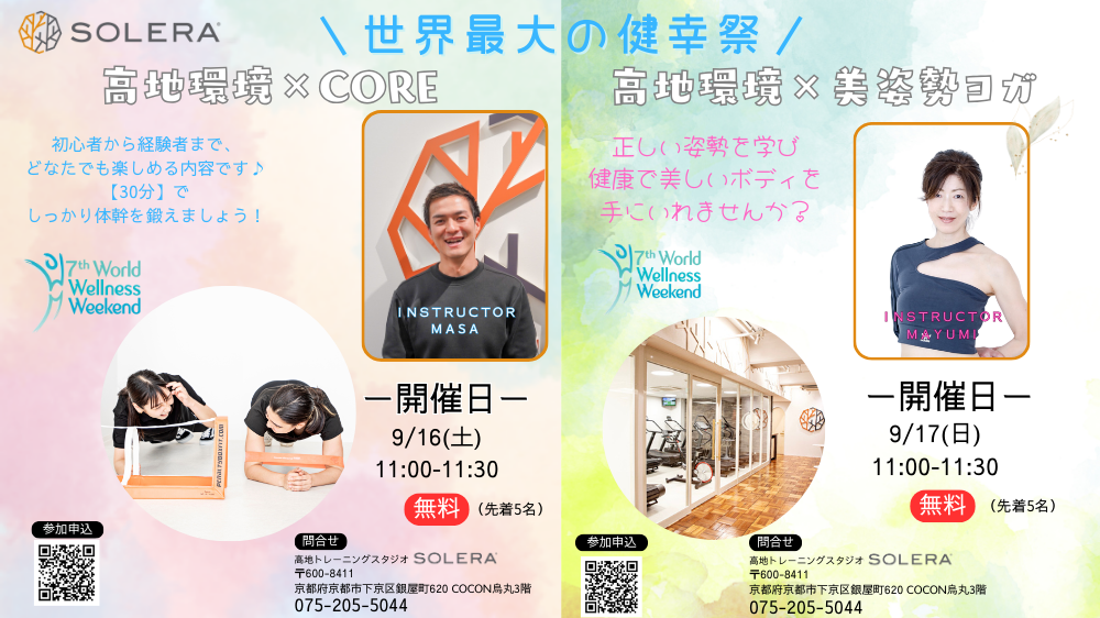 世界8,000会場、日本では全国300以上の会場で、スポーツ・フィットネス・ウェルネスの専門家が、ウェルネス体験クラス・イベントを開催します。京都で唯一の低酸素トレーニングができる「高地トレーニングスタジオSOLERA」でも開催されます。地域の方々のウェルネス体験参加は無料です。地域のウェルネス体験をSNSで発信して、世界でウェルネス・ウェルビーイングな体験を共有します。