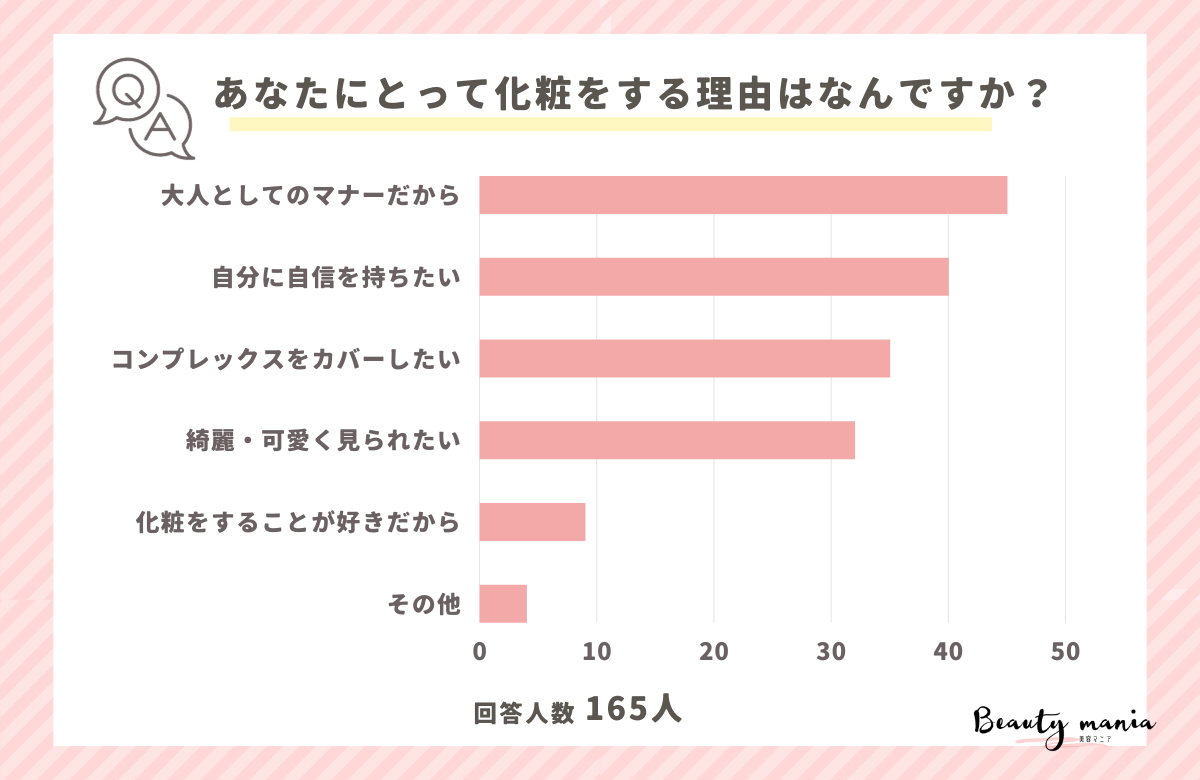 「あなたにとって化粧をする理由はなんですか?」とアンケート調査した結果、1位は『大人としてのマナーだから(45人)』、2位は『自分に自信を持ちたい(40人)』、3位は『コンプレックスをカバーしたい(35人)』となっています。