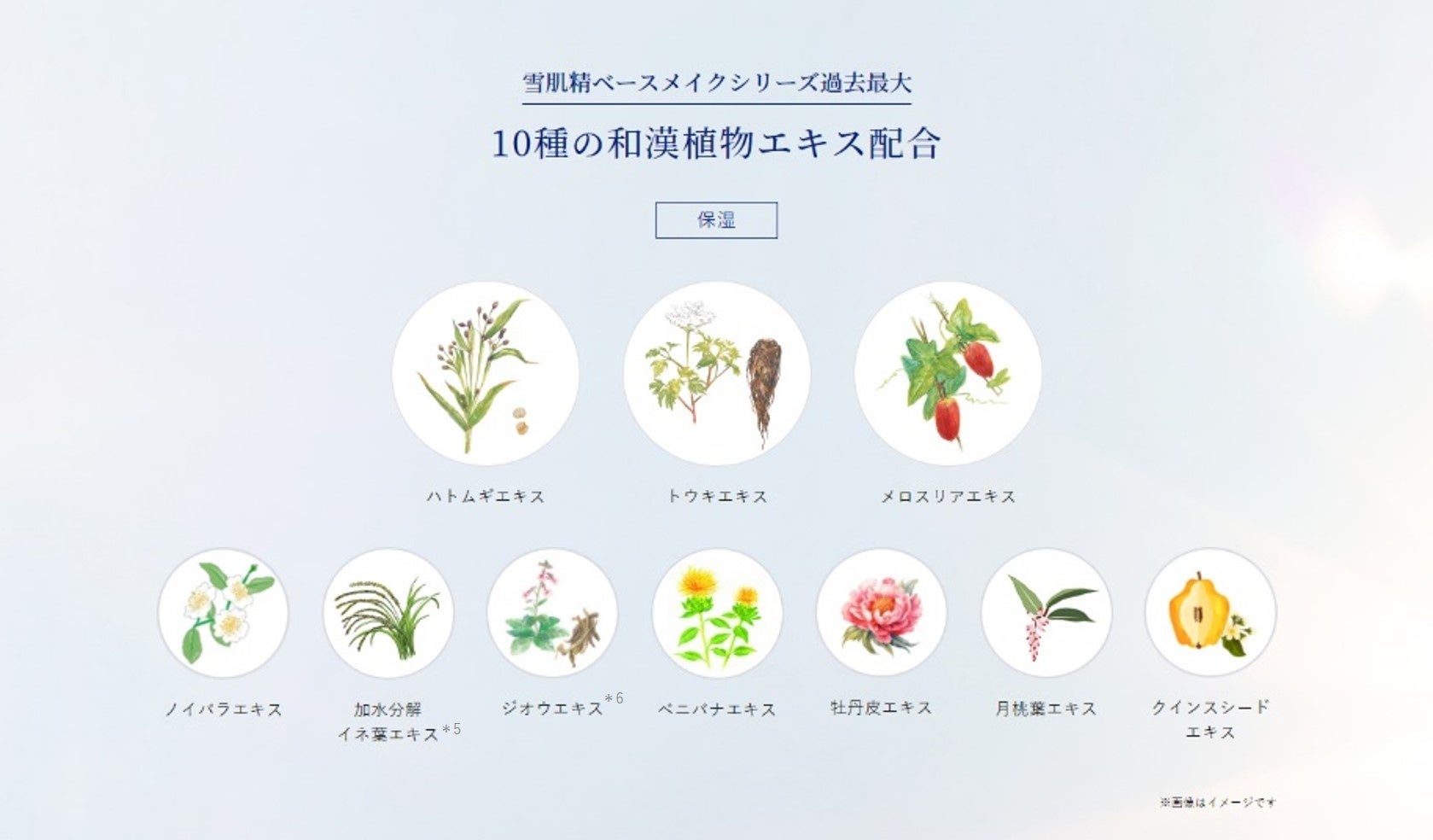透明感の高い板状粉体を新配合、気になる肌悩み(色ムラ・毛穴・シミ・くすみ)をひと塗りで自然にカバーします。さらに、雪肌精ベースメイクシリーズ過去最大の10種の和漢植物配合により、高いスキンケア効果で、メイクしている間中うるおいを逃さず、しっとり透明感のある仕上がりが持続します。