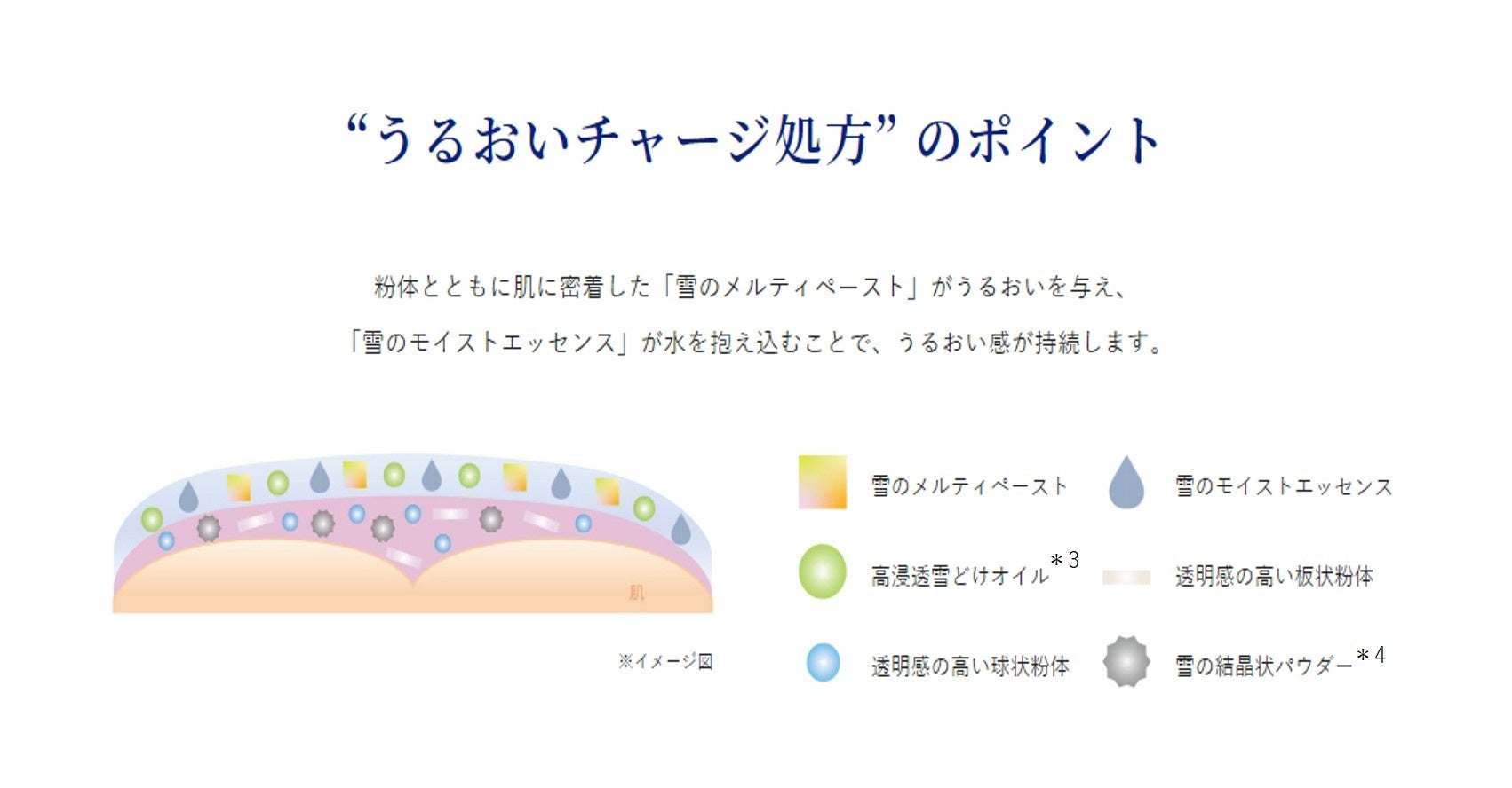 新配合「雪のメルティペースト*1」が、まるで雪のようにさらりと溶け込み、うるおいを補給、同じく新配合「雪のモイストエッセンス*2」が、水分を抱えて肌に密着し、水分蒸散を防ぎます。さらに“うるおいチャージ処方”により、一日中心地よく過ごせるBBエッセンスが実現しました。