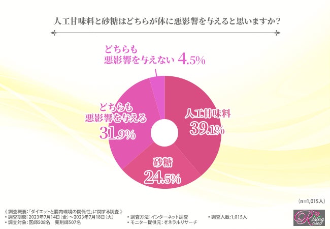 「人工甘味料と砂糖はどちらが体に悪影響を与えると思いますか?」と質問したところ、『人工甘味料(39.1%)』『砂糖(24.5%)』『どちらも悪影響を与える(31.9%)』『どちらも悪影響を与えない(4.5%)』という回答結果になりました。