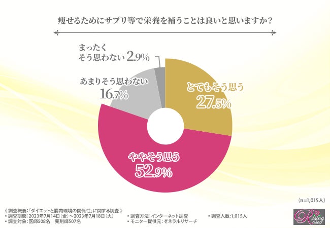 今回の調査で、約8割の方が痩せるためにサプリで栄養を補うことは良いと思っていることが判明しました。