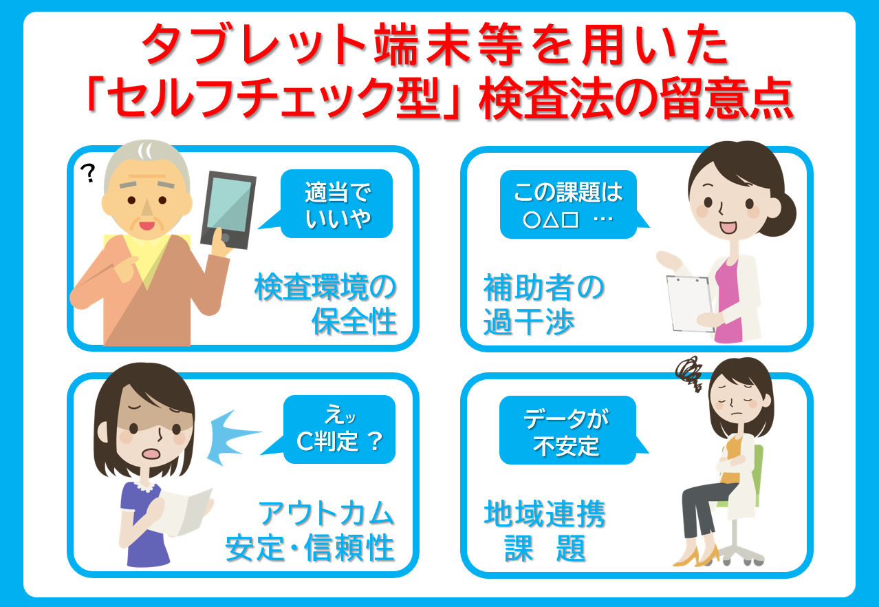 タッチパネル方式で受診者が自身で検査実施する、いわゆる「セルフチェック式」検査法では、正常に検査履行されたことを施設が担保することが難しい点や補助者をつけた際の過干渉の影響等、検査環境保全性やアウトカムの安定・信頼性に課題があり、地域医療との連携を想定する際の運用課題とされてきました。