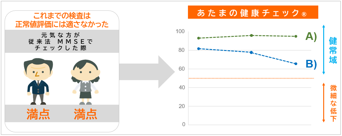 あたまの健康チェック®は、2006年に愛媛大学医学部が国内で初めて採用し、現在では、全国の健診施設や自治体で広く活用される指標となっています。従来の検査法との異なる特徴は、もの忘れの訴えの無い時期から認知機能の状態の正常値の経時観察ができる点です。