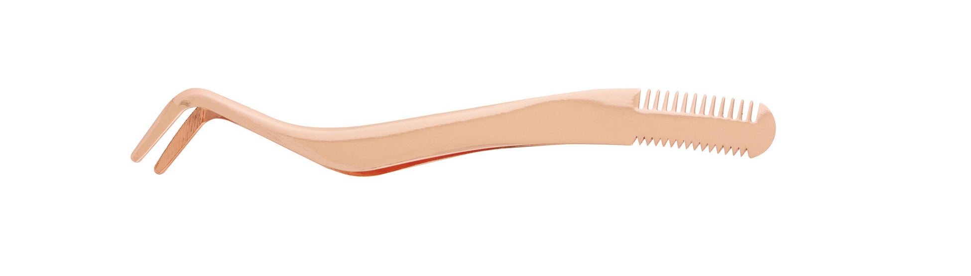 「束感まつげコーミングピンセット」は、マスカラのダマ取りなどに使うトリミングコーム、まつげをまとめて毛束を作るざっくりコーム、毛先をつまんで束の太さや形を整える仕上げピンの3 in 1ツールです。