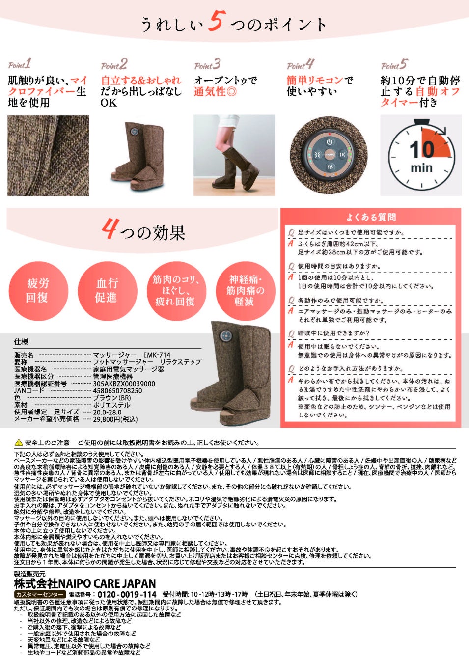 Relaxstep EMK‐714は全国の家電量販店・NAIPO CARE JAPANのECサイト(https://www.rakuten.co.jp/naipocare/)にて販売中です。