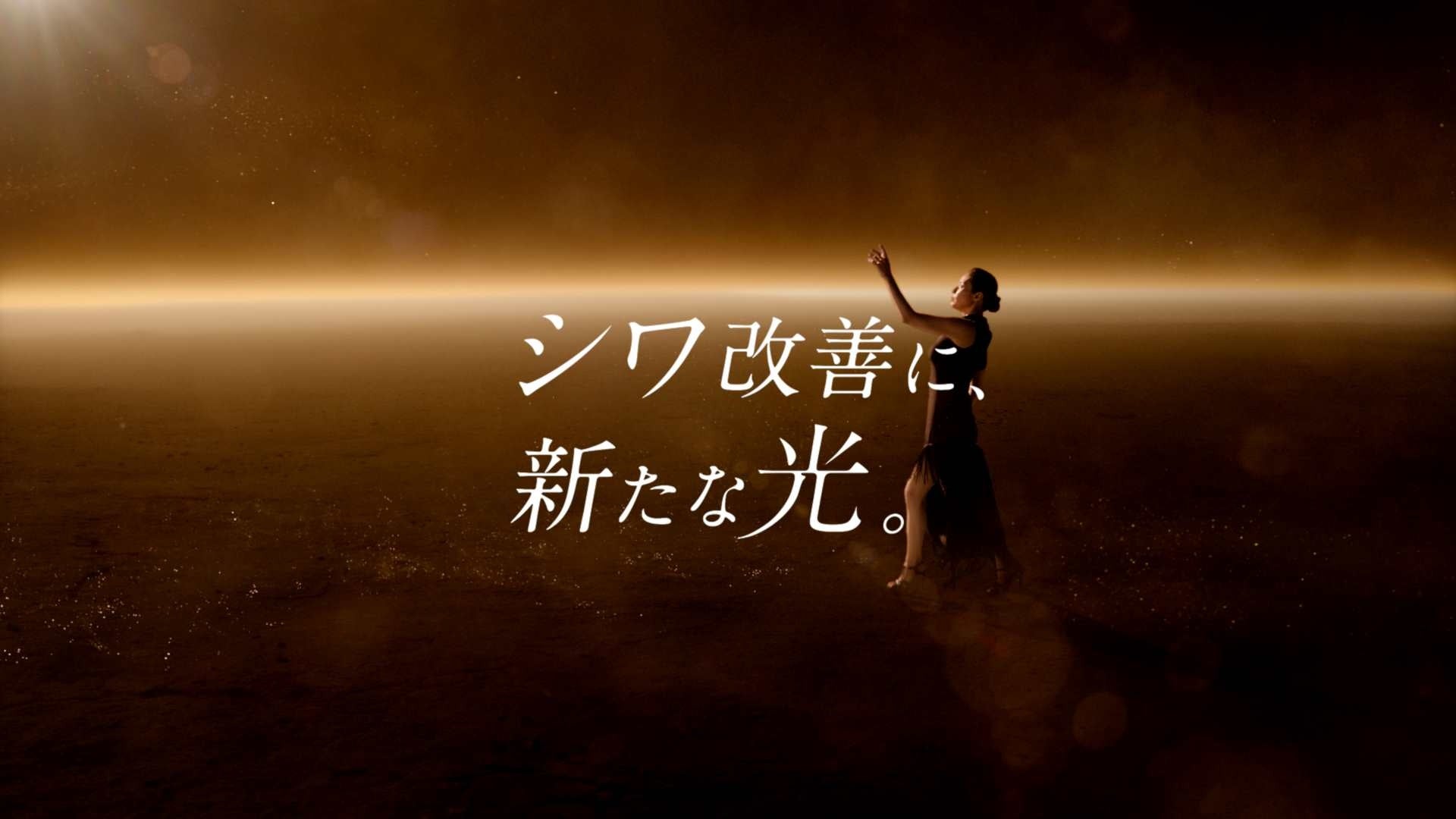 新CMのメッセージは、「シワ改善に、新たな光」。これまでの穏やかな深田さんの雰囲気とは異なり、オールバックで真っ黒な衣装を纏いモードな姿で登場。黒の世界の中で、ダイヤモンドリングの光と深田さんの凛とした表情によって「シワ改善」を想起させるようなCMとなっています。