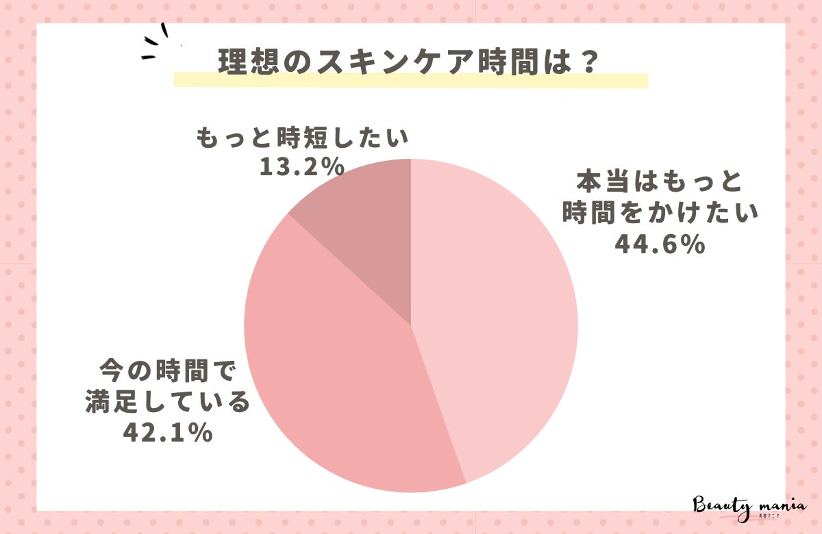 また、理想のスキンケア時間もアンケート調査したところ、1位は『本当はもっと時間をかけたい(44.6%)』、2位は『今の時間で満足している(42.1%)』、3位は『もっと時短したい(13.2%)』でした。