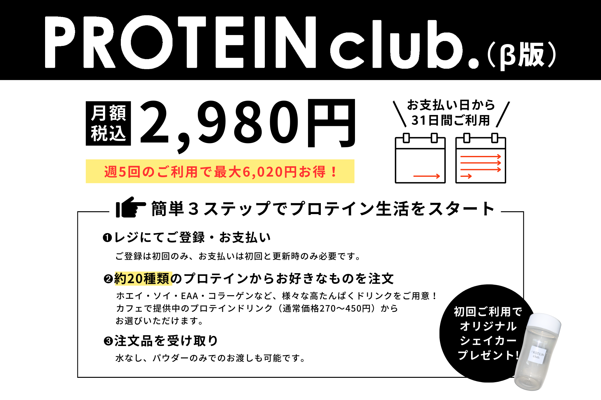 2023年9月19日(火)より開始する『PROTEIN CLUB』β版では、カフェで提供中のメニューからお好きなプロテイン・アミノ酸ドリンク(「糖質ゼロEAA生ビール」「EAAハイボール」等、アルコールメニューを除く)を利用期間中1日につき1杯テイクアウトにて注文することができます。