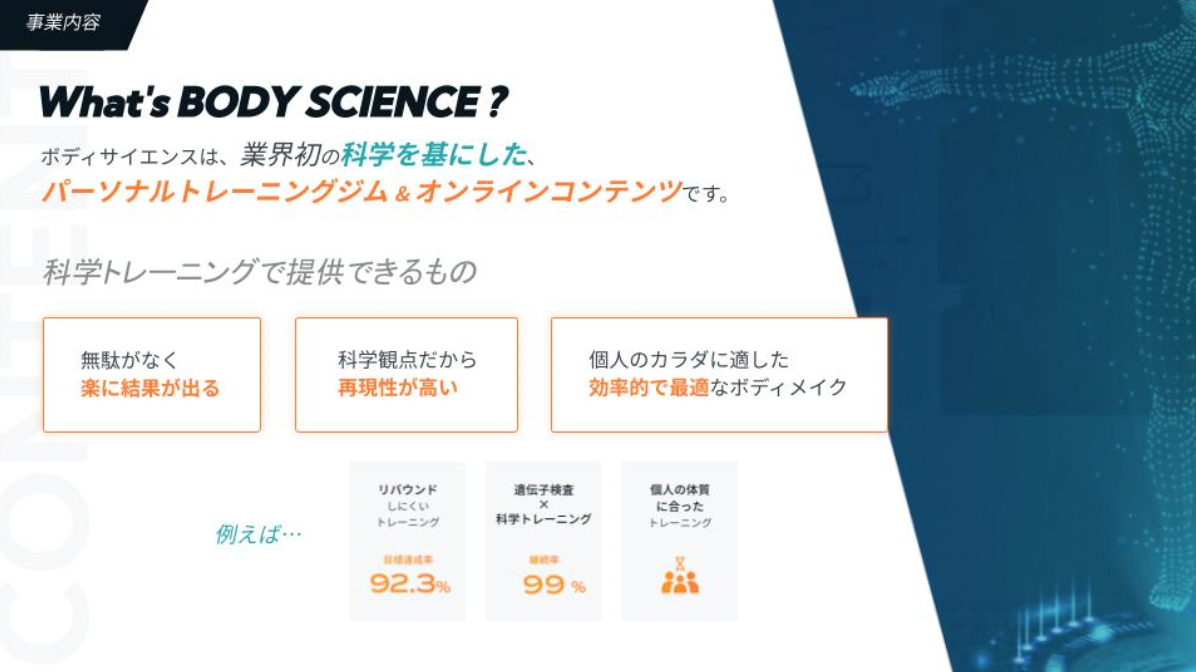 パーソナル科学トレーニングジム「BODY SCIENCE」は、遺伝子検査や、正確に部位別の筋肉量・体脂肪量の変化が把握できる体成分分析装置の「インボディ」を組み合わせることで、無駄なく無理なくお客様の目標達成することでき、再現性が高いトレーニングを提供することが可能な点が最大の特徴で、科学に基づいたトレーニングを提供するパーソナルジムは業界で初めてとなります。(当社調べ)