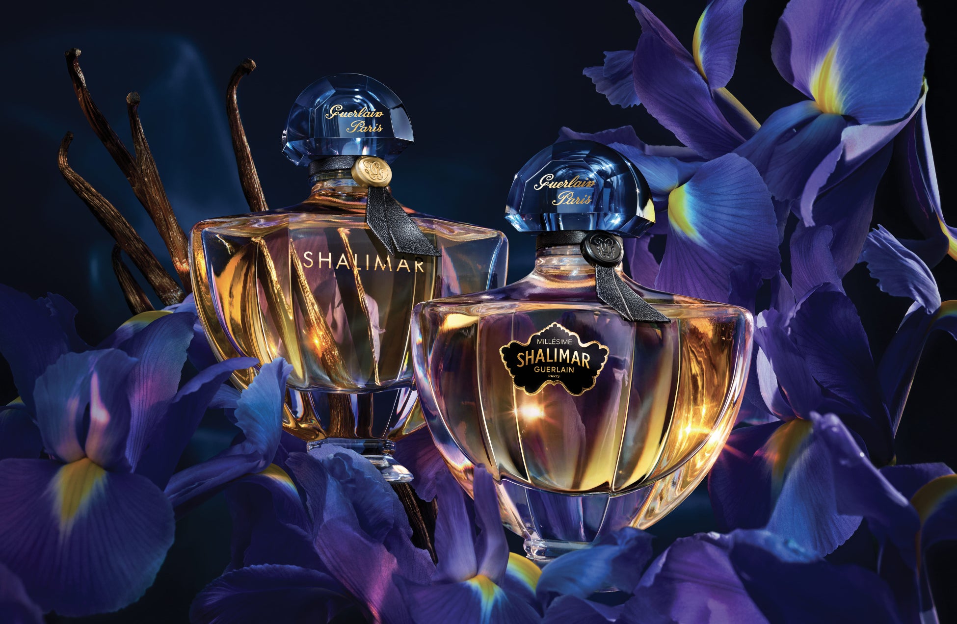 前作に続き、ブラックレザーのカラーが施され、〈シャリマー〉の象徴として有名な「コウモリ型」のラベルは、アイコニックなキャップとアイリス・パリダの花びらの色を思い起こさせるブラックブルーの色合いに。フレグランスのゴールドカラーはアイリスの中心部分を思い起こさせ、この1 年に1度の〈ミレジム〉をより特別なものに仕立てています。
