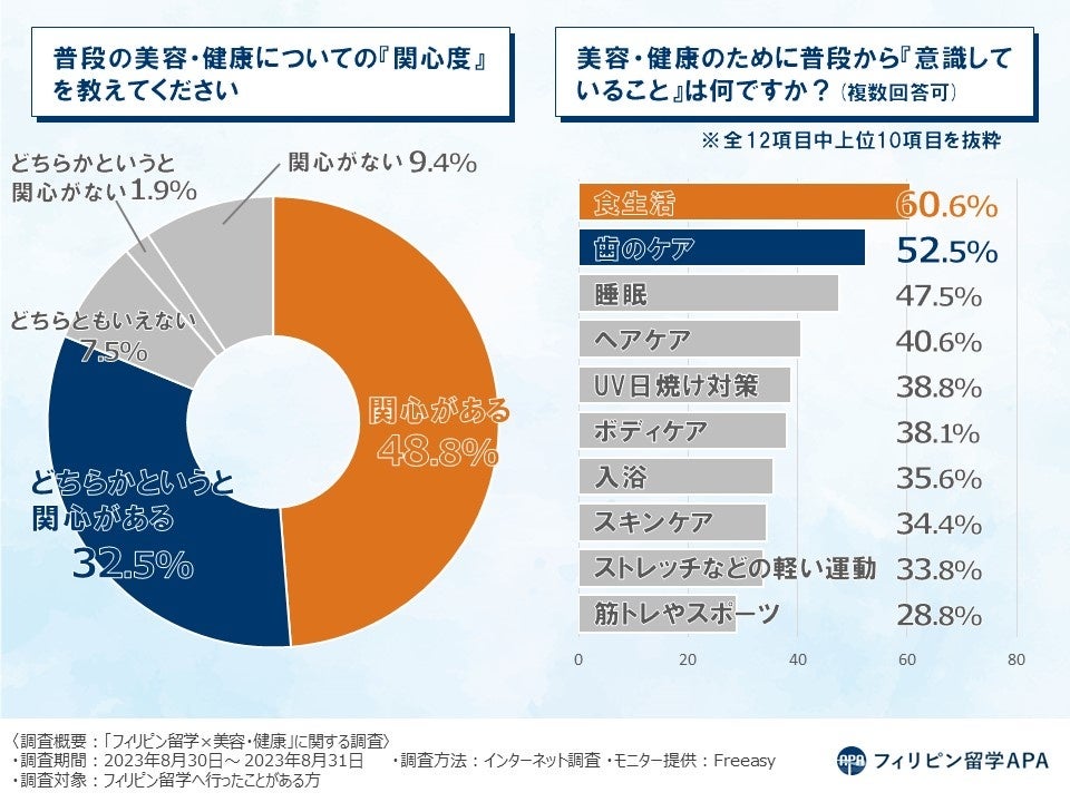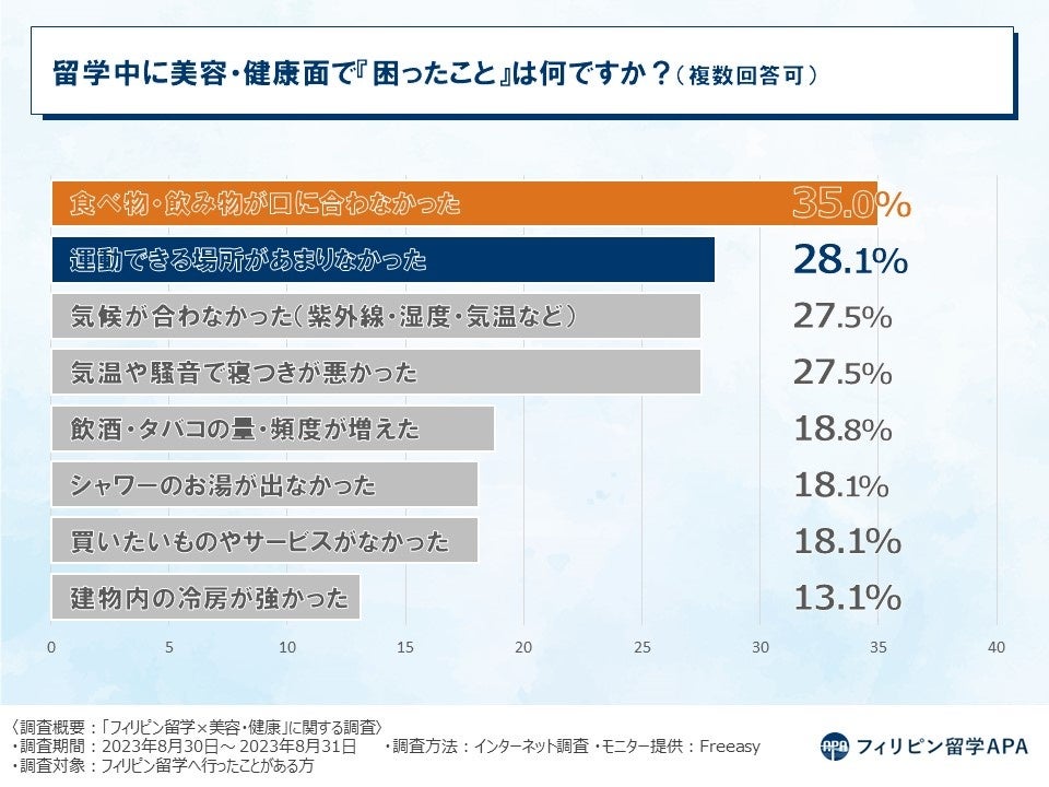 今回、『フィリピン留学APA』を展開しているALEBA株式会社(https://phl-ryugaku-apa.com/)は、フィリピン留学経験者を対象に、「フィリピン留学中の美容・健康」に関する調査を実施しました。