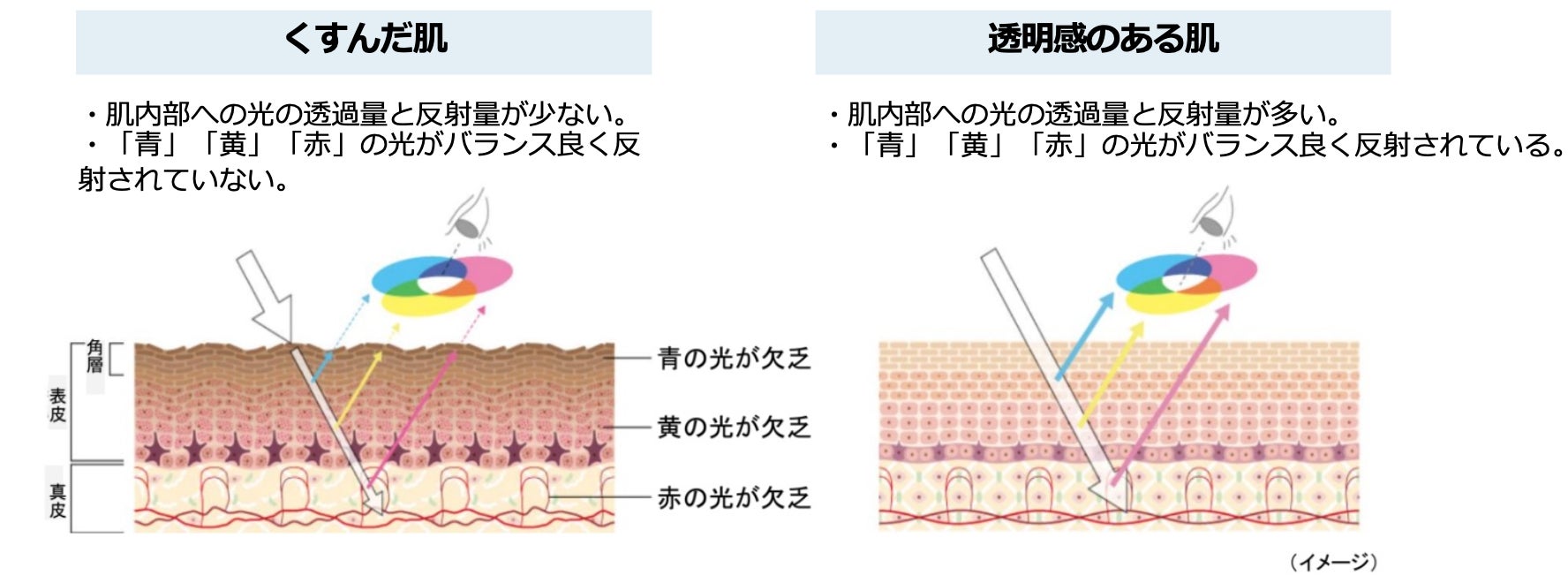1人ひとり異なる肌に足りない光を補い、光学ひずみを補正することで、3色の光バランスが整った透明感のある肌へ導きます。