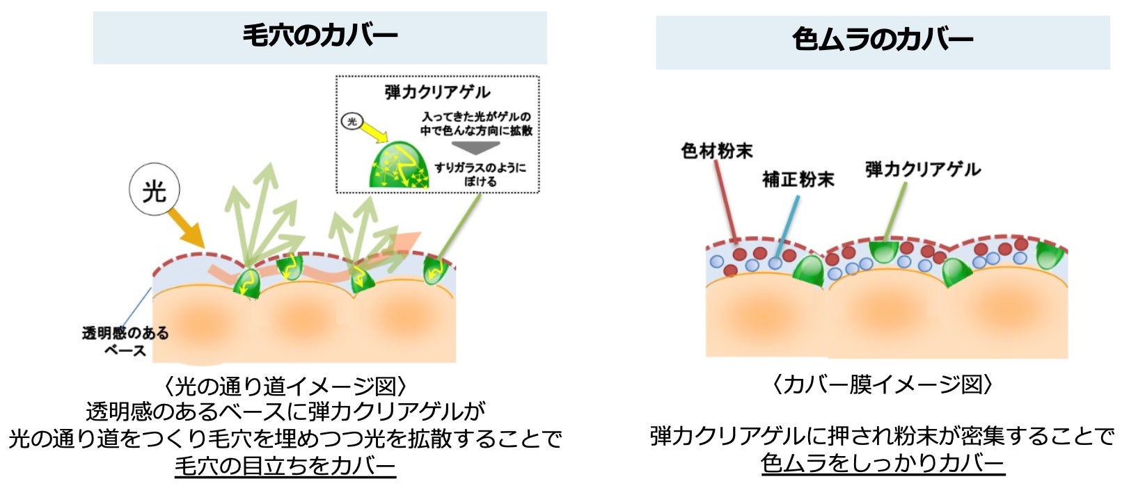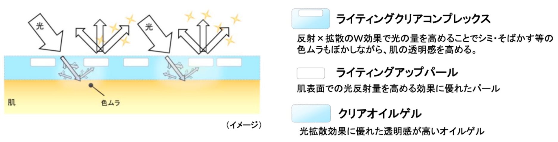 極薄のファウンデイションのカバー膜に弾力クリアゲルを配合し、光の通り道をつくり光を拡散させることで、毛穴の目立ち・色ムラをカバーしながら透明感のある仕上がりを実現します。