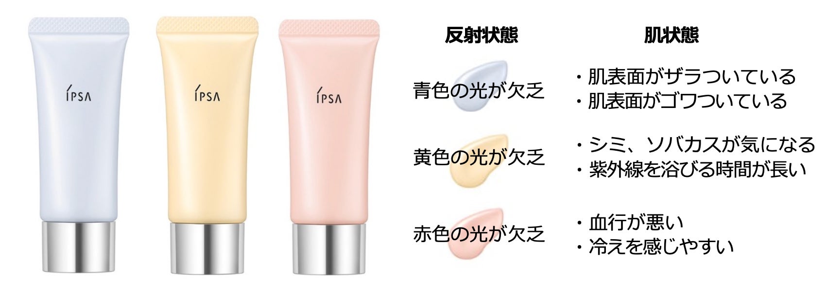 そんな「肌不作の年」、夏のダメージによって引き起こしやすい“ゴワつき”“シミ・ソバカス”“くすみ”などの肌悩みは、肌の光の反射バランスまで乱れてしまい、どんよりとくすんだ肌印象になってしまう可能性があります。イプサでは、独自の光学ひずみ理論に基づき、1人ひとりの素肌に足りない「青」「黄」「赤」の光の色を補い、3色の反射バランスを整え透明感を高める「コントロールベイスe」や、これからの秋・冬の時期に夏のダメージを感じさせない、肌状態や仕上がりの好みに合わせて選べるファウンデイションなどのベイスメイクアイテムのおすすめの組み合わせとそのポイントをご紹介いたします。