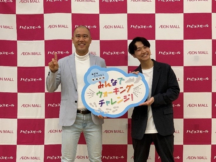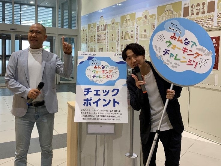 この「めざせてっぺん!地域対抗! みんなでウォーキングチャレンジ!」のスタートに合わせ、9月18日(月・祝)にイオンモール広島府中(広島県安芸郡)の特設会場にて、お笑いコンビ「コロコロチキチキペッパーズ」のナダルさん・西野創人さんを招いてのイベントを開催しました。