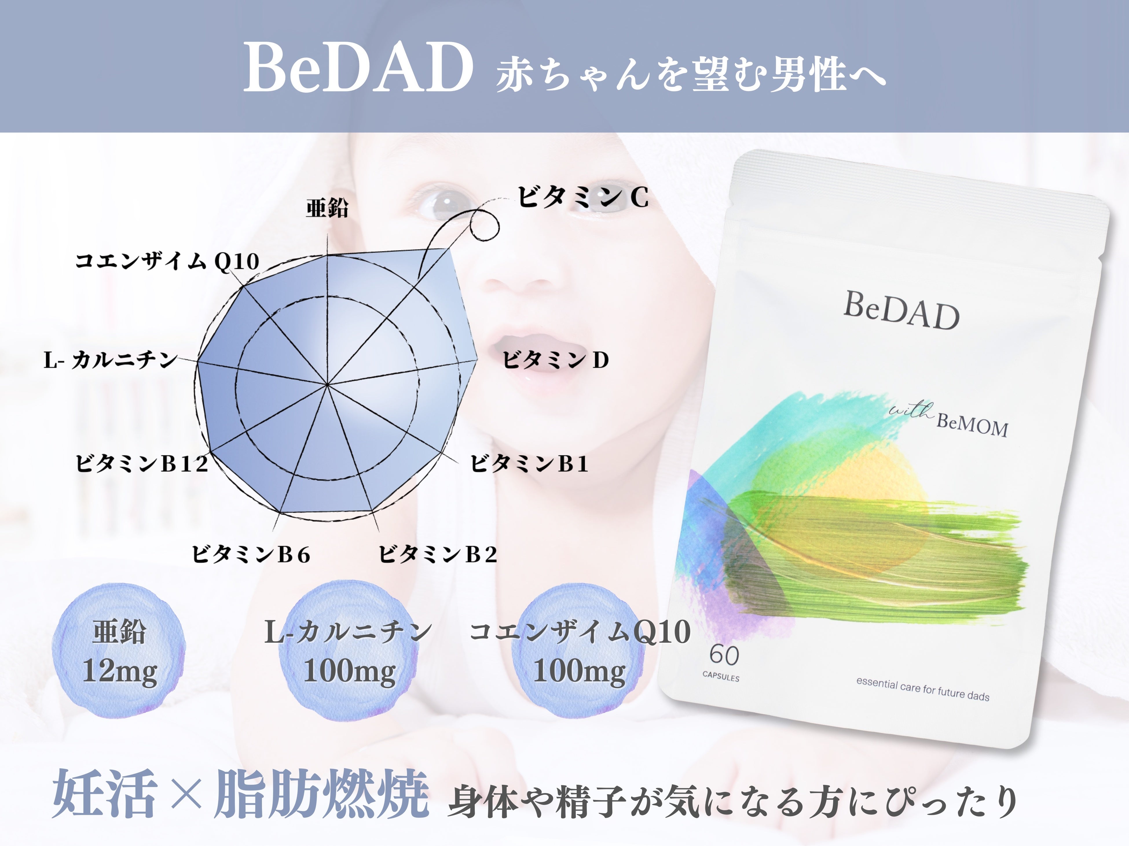 『BeDAD』では、精子の質と量の改善・脂肪燃焼が期待できる可能性が示唆さる成分と、日々の必要なビタミンやミネラルを配合しています。仕事で忙しい男性は偏った食事や十分に栄養が摂れていない方も多いのではないでしょうか。毎日の食事だけでは摂りきれない栄養をサプリメントで補えるように作りました。