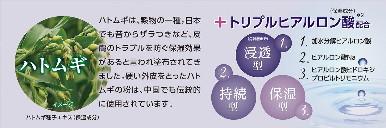 *2 トリプルヒアルロン酸:ヒアルロン酸Na、ヒアルロン酸ヒドロキシプロピルトリモニウム、加水分解ヒアルロン酸(すべて保湿成分)