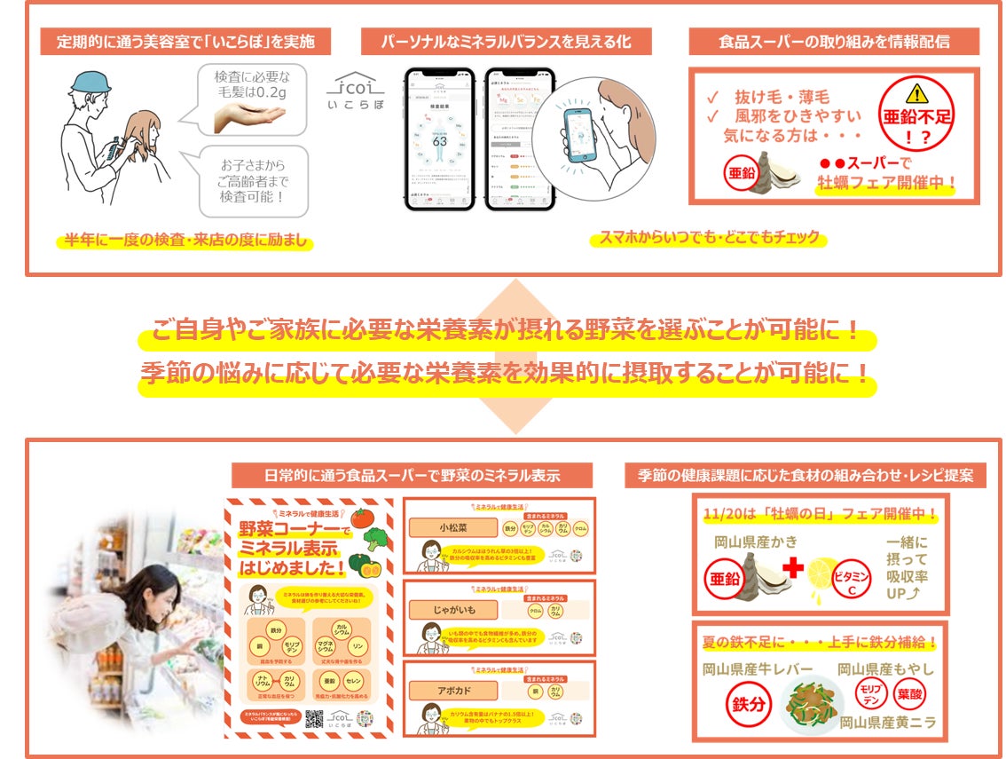 icoiが提携する美容室で「いこらぼ(毛髪栄養検査)」を提供し、パーソナルなミネラルバランスを見える化します。近隣の食品スーパーでは、各野菜に含まれるミネラル表示を行います。これにより「いこらぼ」で明らかになった個々人のミネラルバランスに合わせ、改善を促すために必要な食材を購入することが可能になります。さらに食品スーパーでは、寒さに備えた温活、汗をかく時期のミネラル不足など、季節特有の悩みに応じた栄養素を効果的に摂取できる旬の食材の組み合わせやレシピの提案を行います。これらの情報は美容室からも発信することで、相互送客を図ります。(現在、食品スーパー42店、美容室21店を双方順次拡大)