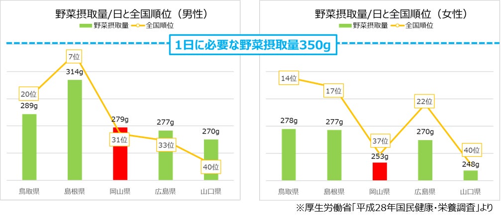 岡山県民の1日野菜摂取量の平均は、男性279g・女性253gで、全国と比較して少ない傾向にあります。全国ランキングを見ても、男性31位・女性37位と低迷しています。