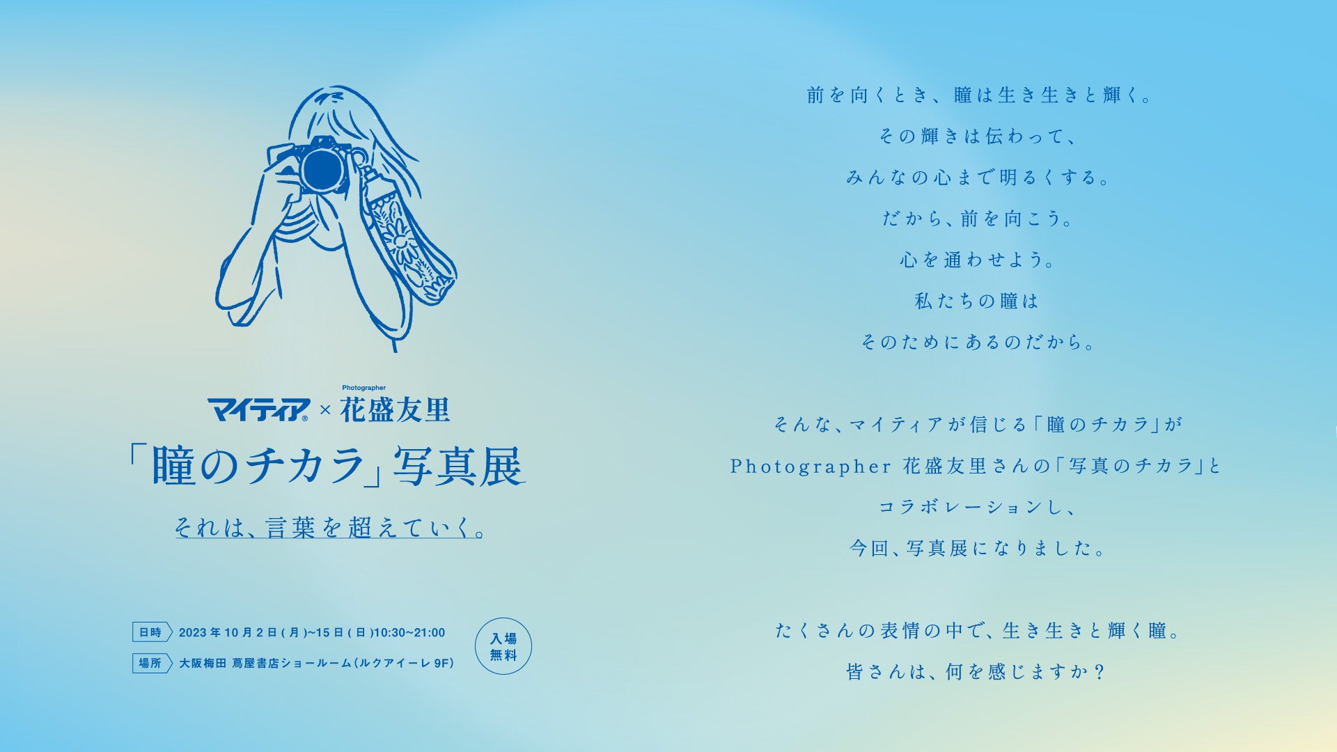 また、本写真展の開催を記念して、抽選で20名様を花盛友里さんによる 「瞳のチカラ」撮影会へご招待します。撮影した写真は後日マイティアの「瞳のチカラ」を伝える広告企画に活用させて頂く予定です。さらに、10月8日(日)には、花盛友里さんによる「瞳のチカラ」をテーマにしたトークショーも実施いたします。