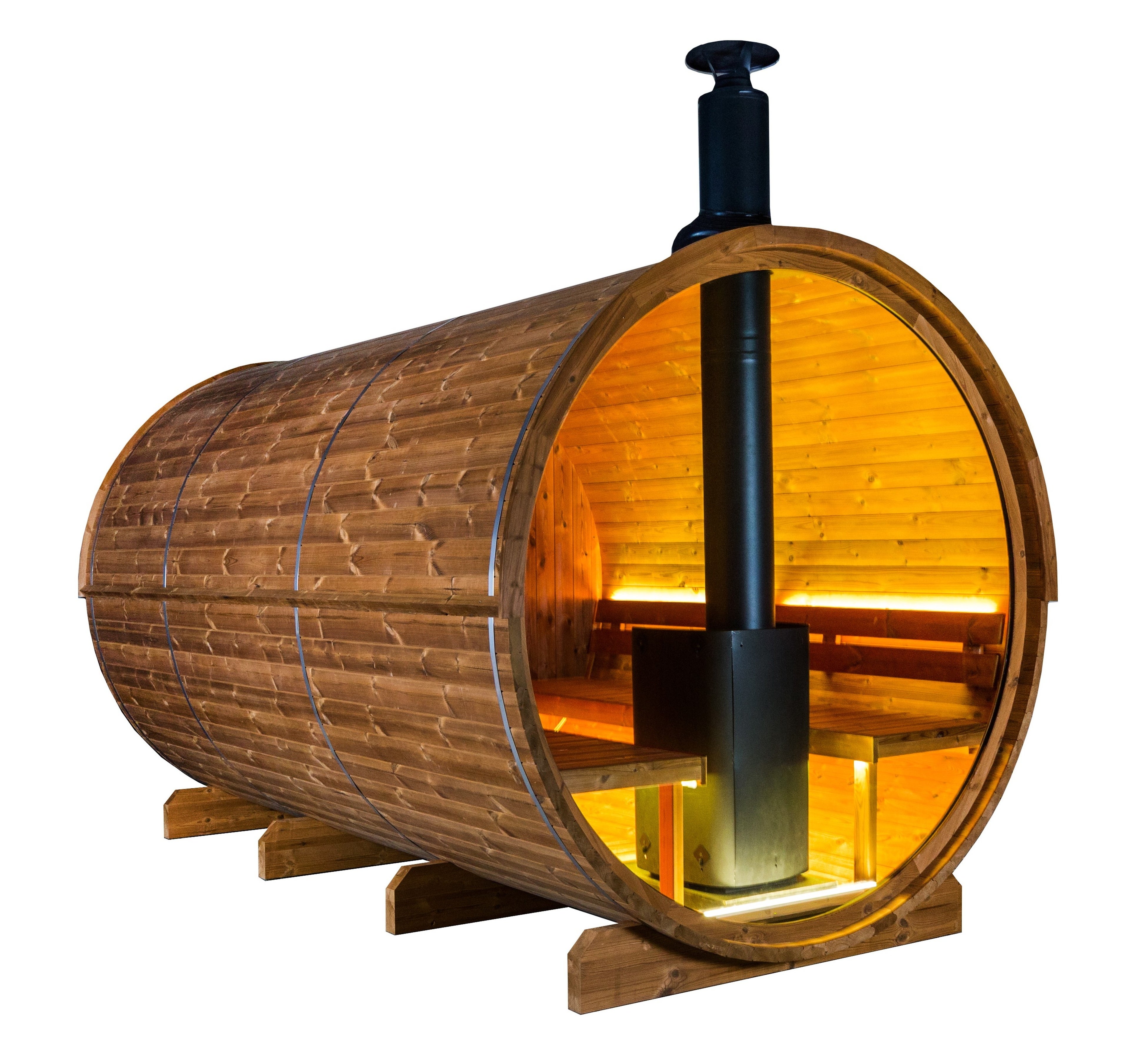 新バレルサウナのサイズはコンパクトな奥行き1840mm(定員3~4人)と前室付きの3660mm(定員5~6人)の二種類。大径窓は半円タイプのハーフムーンと全面窓のフルムーンから選べます(バレル2218はハーフムーンのみ)。また、奥行き3660mmのタイプはヒーターも電気か薪のどちらかからお好みのものをお選びいただけます。