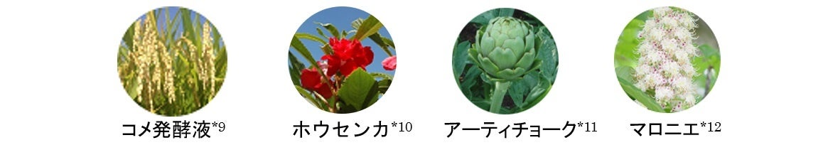 *2 バクチオール、ワレモコウエキス、エーデルワイス花/葉エキス、オドリコソウ花/葉/茎エキス、セイヨウナツユキソウ花エキス、サッカロミセス/コメ発酵液、ホウセンカエキス、アーチチョーク葉エキス、セイヨウトチノキ種子エキス