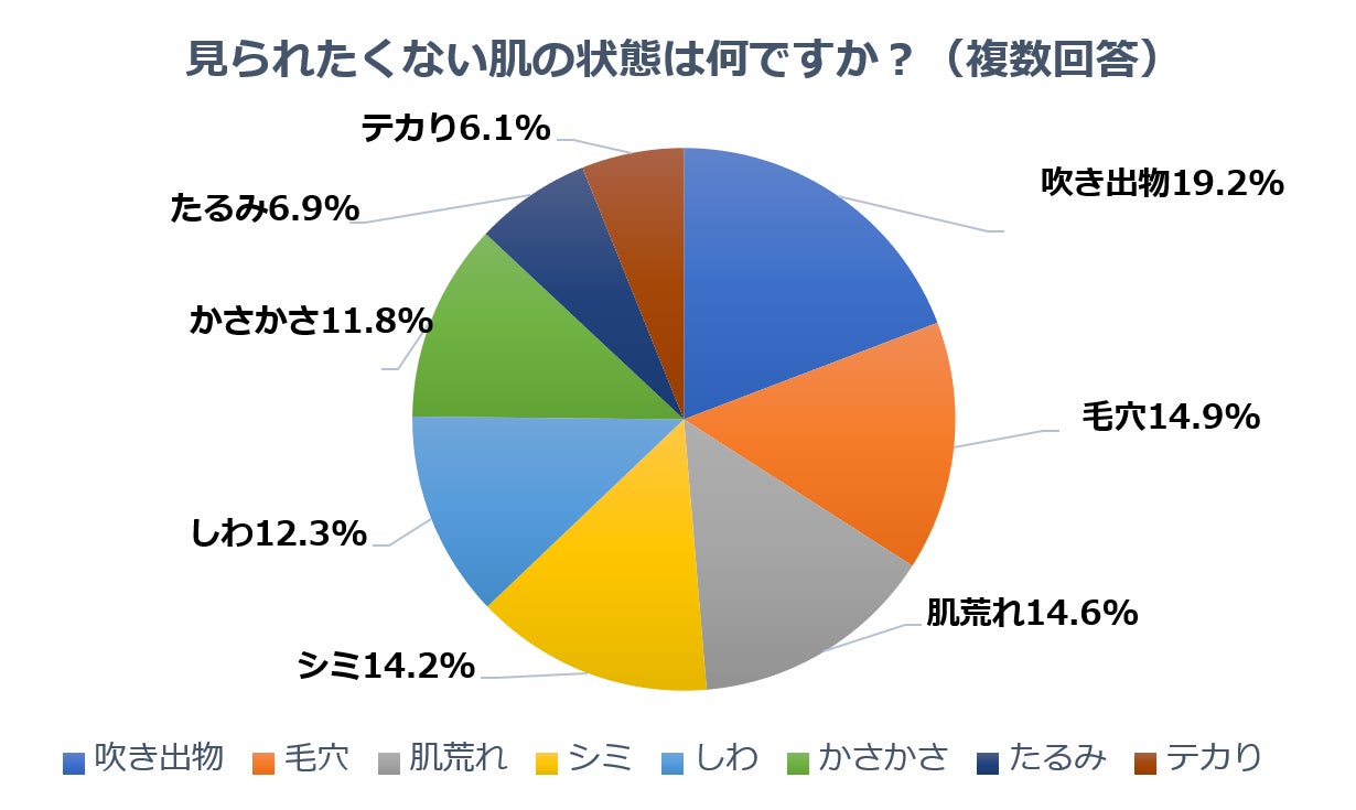続いて、「見られたくない肌の状態は何ですか」と質問したところ、最も多い回答が「吹き出物」19.2%、続いて「毛穴」14.9%、「肌荒れ」14.6%、「シミ」14.2%、「しわ」12.3%、「かさかさ」11.8%、「たるみ」6.9%、「テカり」6.1%という結果になりました。